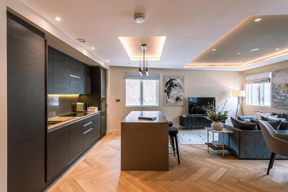 Located on the ground floor, this impressive two bedroom apartment offers spacious and flexible living, with own private entrance. The inner hallway, with cupboard housing a washer/dryer leads into the huge open plan living/dining/kitchen space. The apartment features engineered oak flooring, coffered ceilings and media wall allowing for differentiation between areas if desired. An area has been carefully planned to include built in shelving and space for working from home if required. The kitchen area is fitted with a wide range of units incorporating an array of integral Neff appliances and sink with waste disposal. A breakfast bar island offers additional storage and a useful seating area.