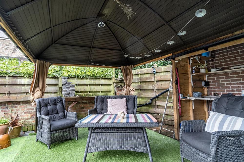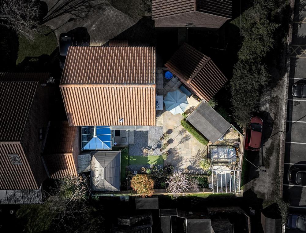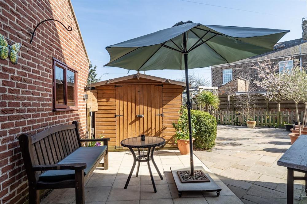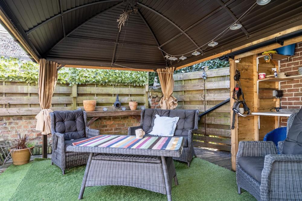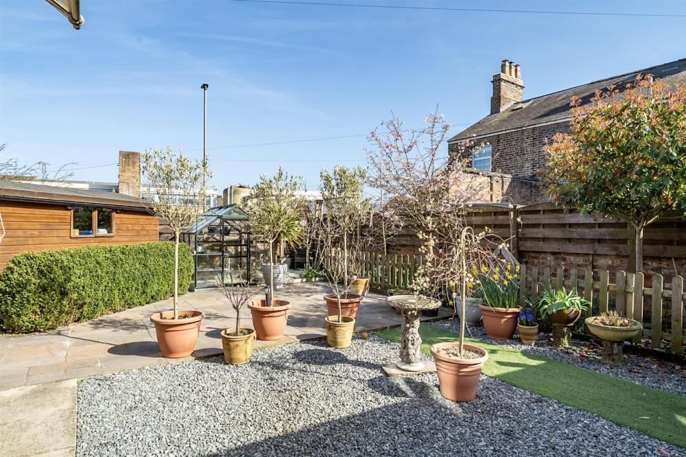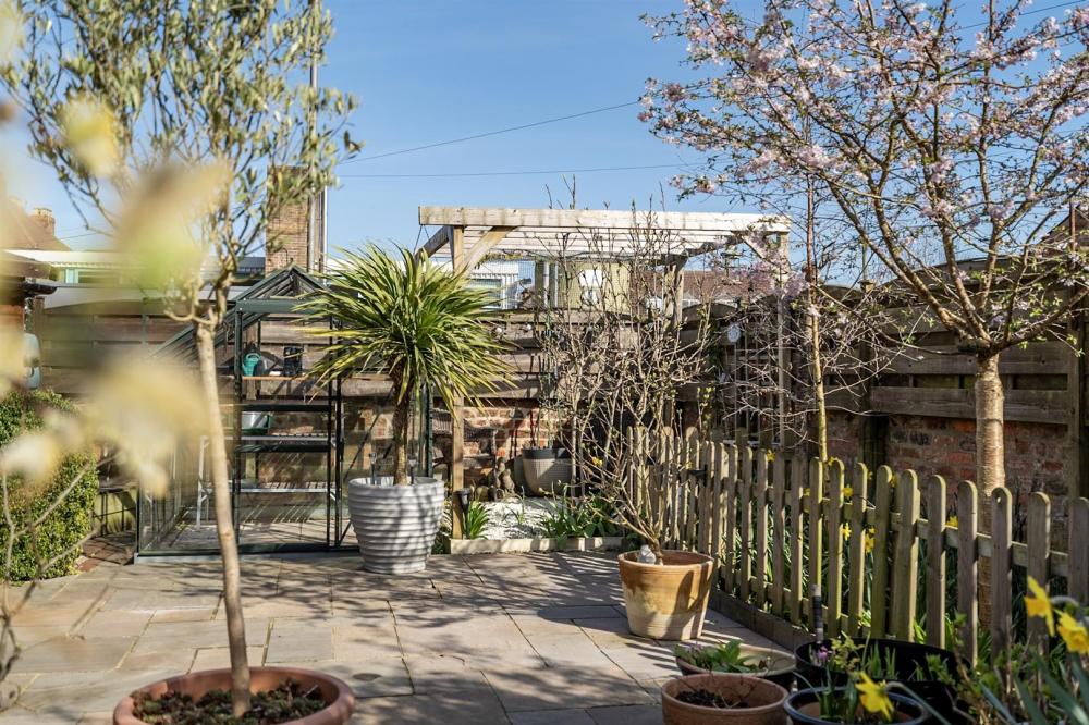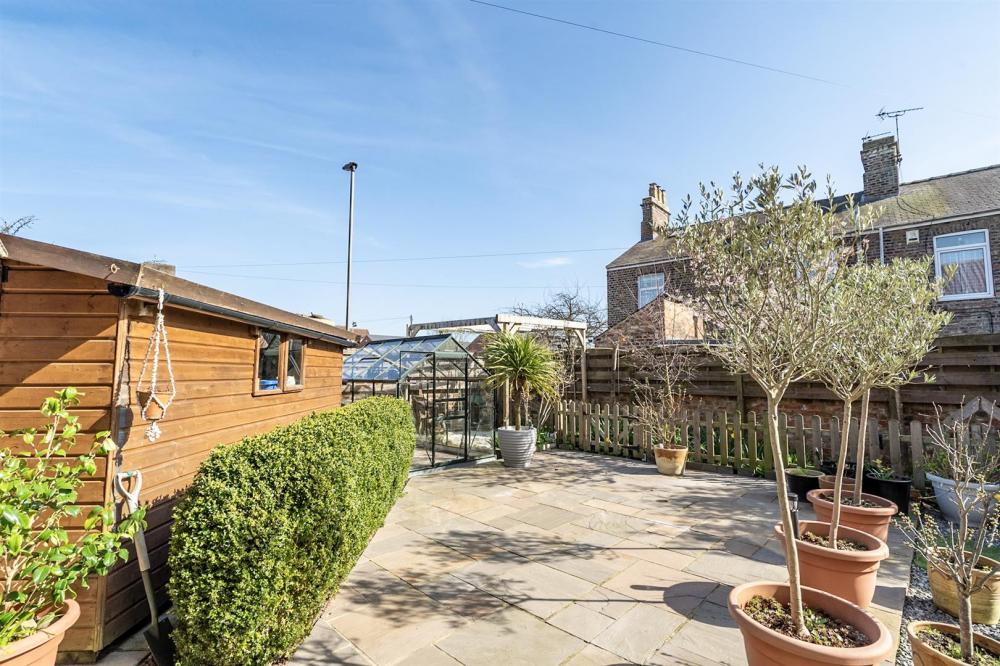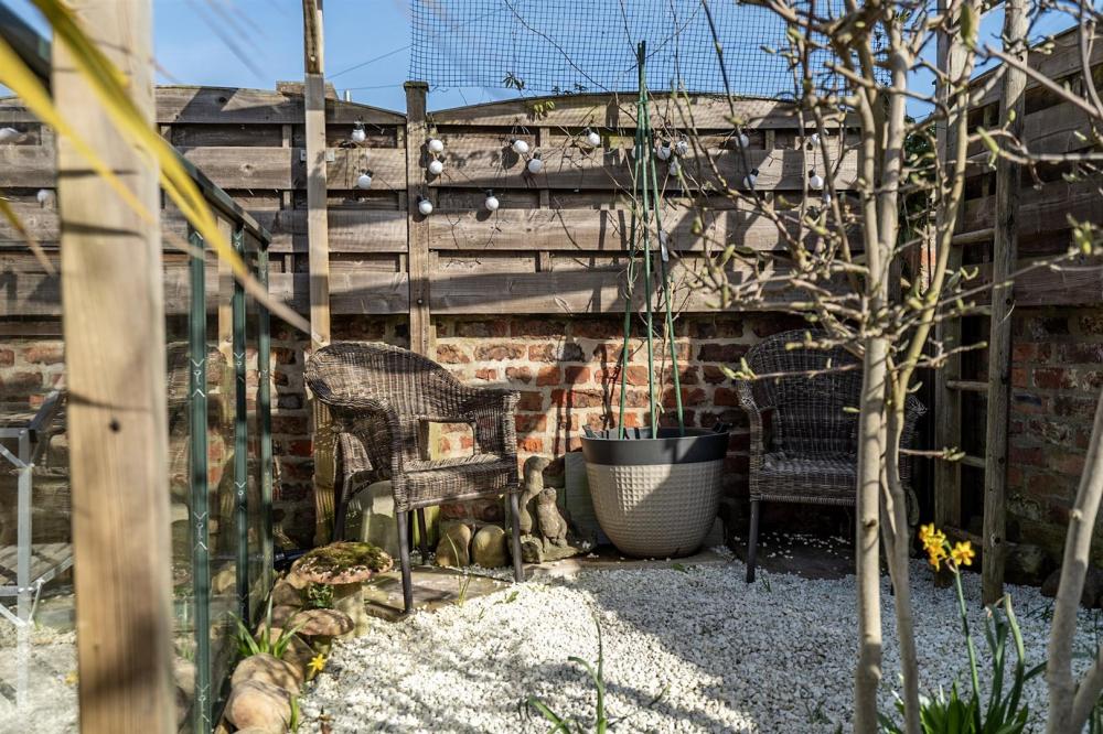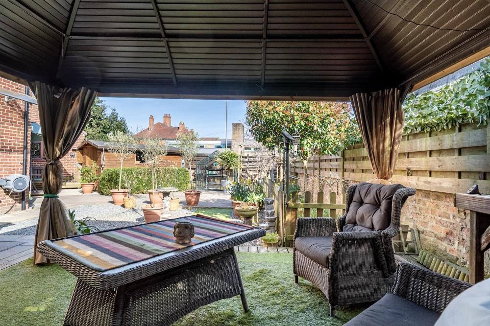 Outside, a brick-set driveway provides off-street parking and leads to a single detached garage. To the rear, the private, low-maintenance garden includes a paved patio, timber shed, greenhouse, and an impressive covered seating area, perfect for outdoor dining and entertaining throughout the seasons.