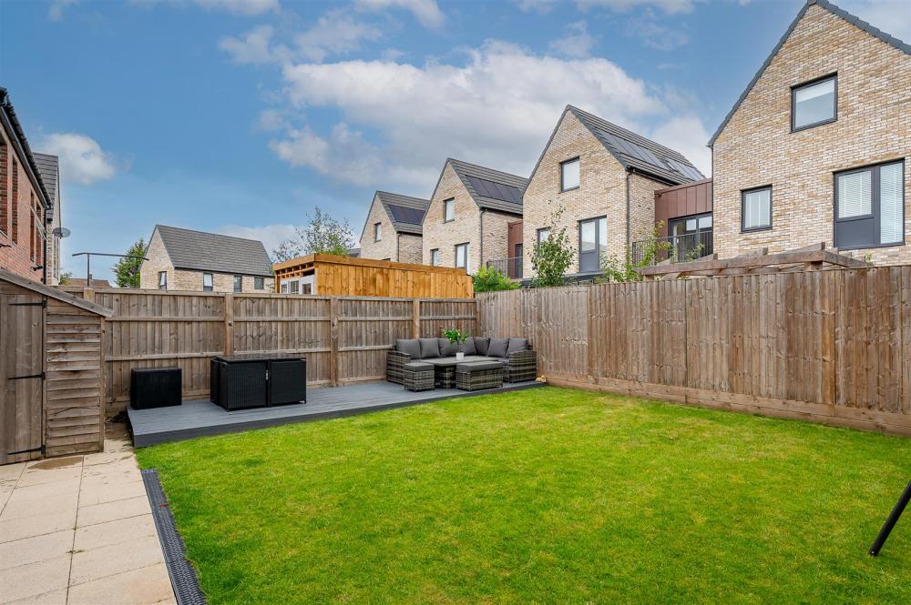 The rear garden is fully enclosed, featuring a lawn, paved patio, timber shed, and a separate decking area that enjoys sun for much of the day.