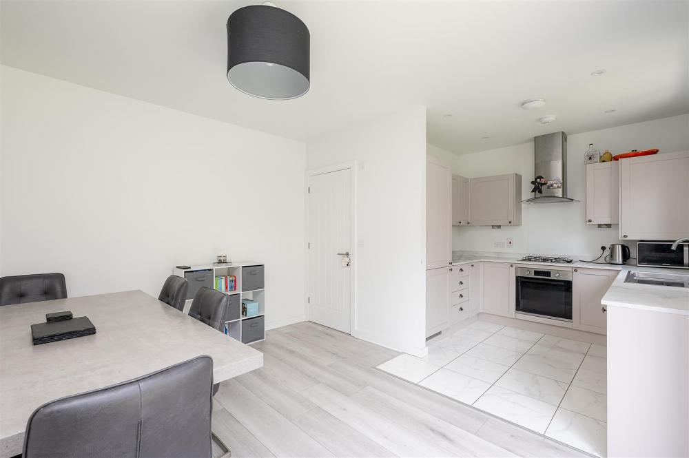 To the rear, the open-plan kitchen diner offers a functional and sociable space. It features a range of white-fronted units, integrated oven, gas hob, extractor fan, and tiled flooring. The dining area benefits from light laminate flooring and sliding patio doors that open directly onto the garden.