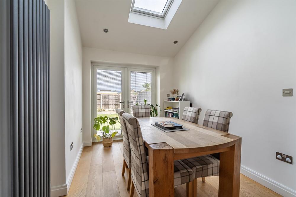 From the sitting room, a flat archway takes you through to the open plan dining kitchen. The bright dining area lies within the rear extension and benefits from a skylight and French doors out to the patio. The superbly fitted kitchen features light fronted units incorporating an eye level Bosch oven and microwave, Bosch dishwasher and tall fridge/freezer, a separate gas hob with extractor hood and a central island breakfast bar with additional under storage. To the rear of the kitchen is a ground floor WC and separate utility area with integrated Hoover washing machine.