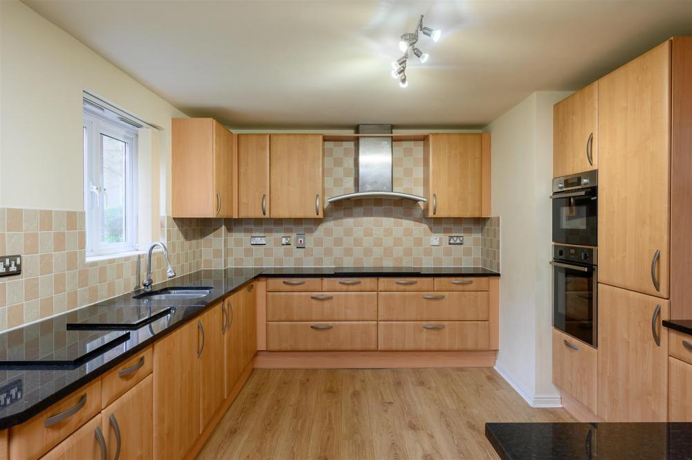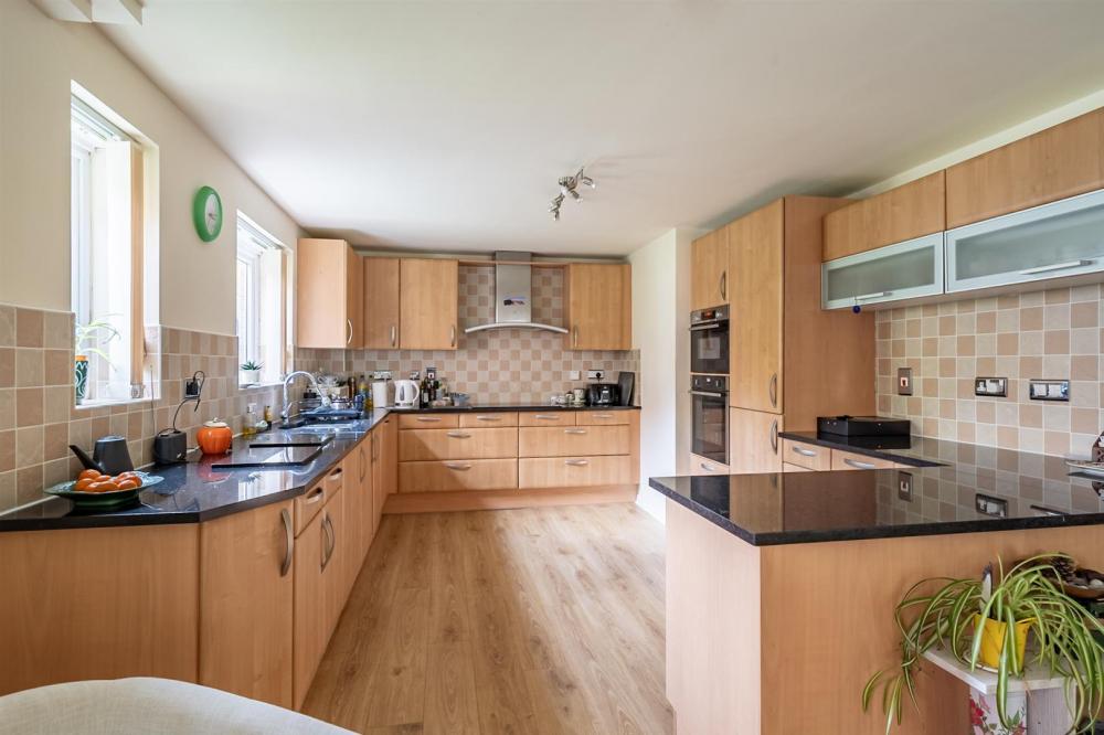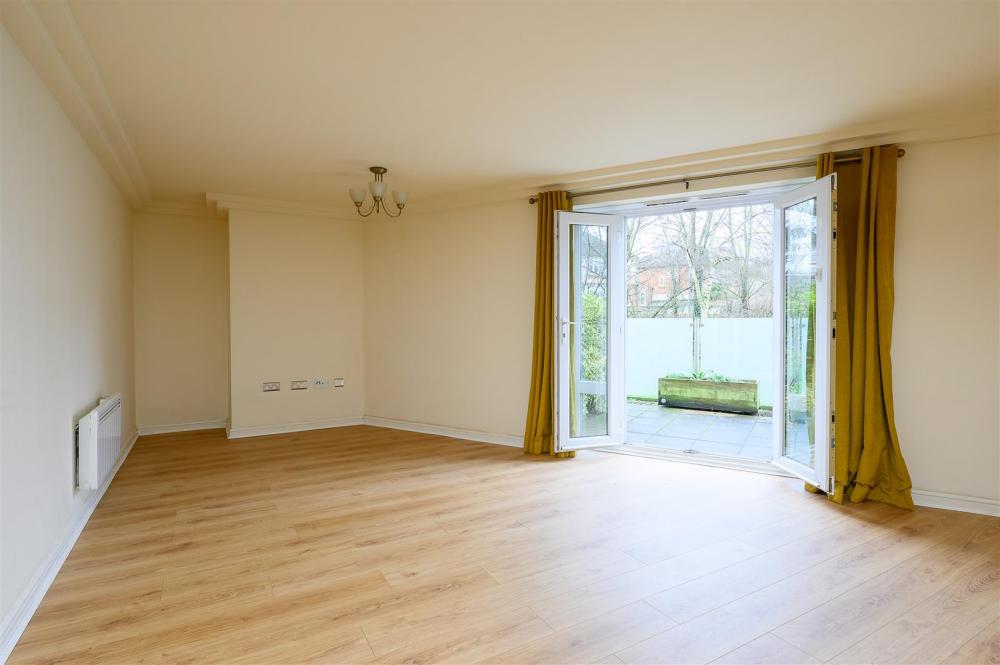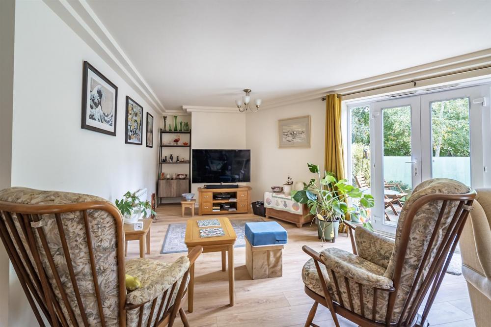 At the end of the hallway, double glazed doors open into the stunning open plan living space, which is bright, spacious, and beautifully presented. Two sets of French doors, one leading to a private patio, fill the room with natural light and offer pleasant views of the leafy gardens. The kitchen area, positioned to one side, features a comprehensive range of wood-effect fitted units and high quality integrated appliances, including a Neff eye-level oven, Bosch microwave, fridge freezer, dishwasher, washing machine, and a separate induction hob with extractor hood. A stylish breakfast bar separates the kitchen from the dining area, creating a practical and sociable layout.