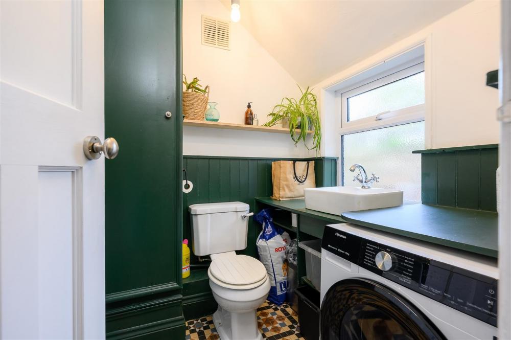 The ground floor comprises a spacious living room with a charming feature open fireplace, continuing through into an open-plan kitchen/diner with patio doors opening onto the rear courtyard. The contemporary kitchen has space for a tall freestanding fridge/freezer and is fitted with integrated appliances, including a dishwasher, oven, and gas hob, and leads to a utility room with space for a washer and dryer, as well as a convenient downstairs WC.