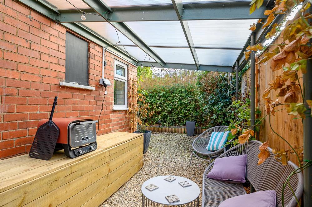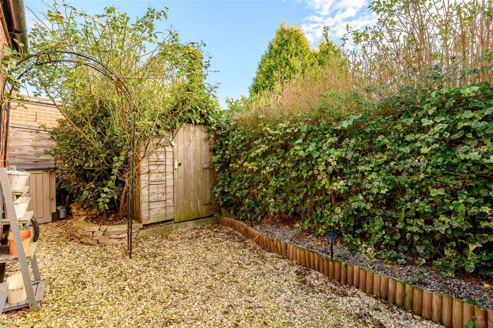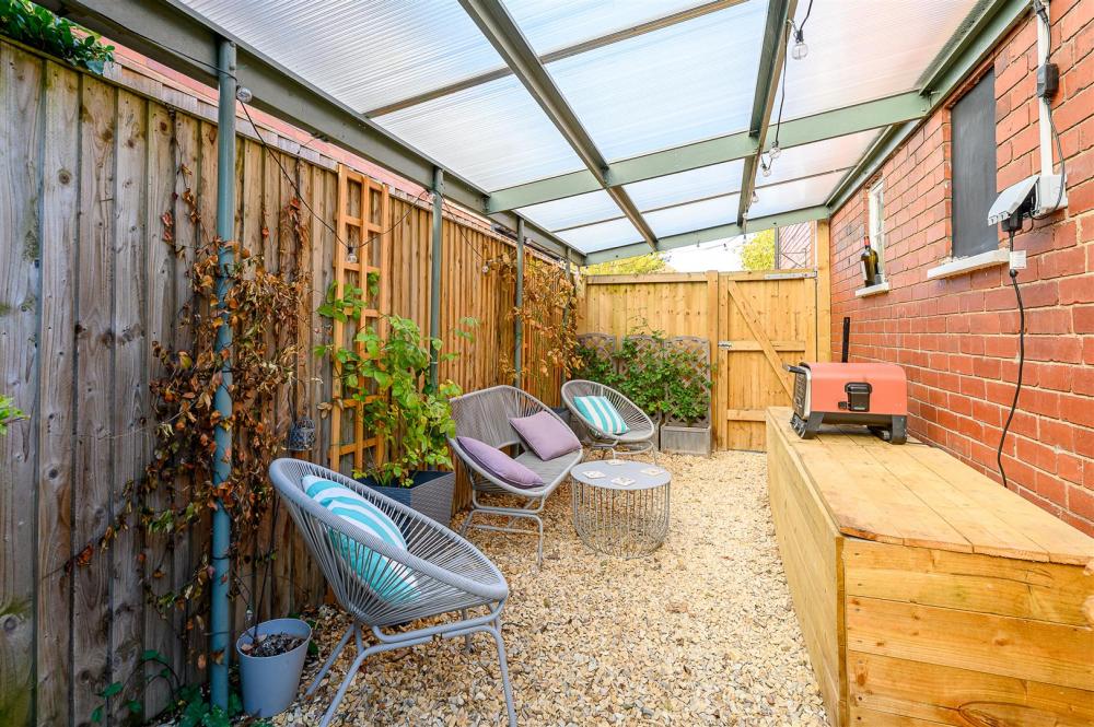 Outside, there is a covered seating area providing valuable outdoor space, along with a small gravel garden and useful store shed to the rear.