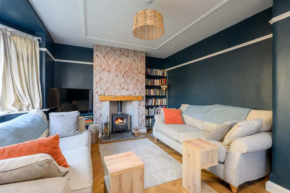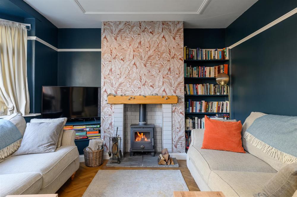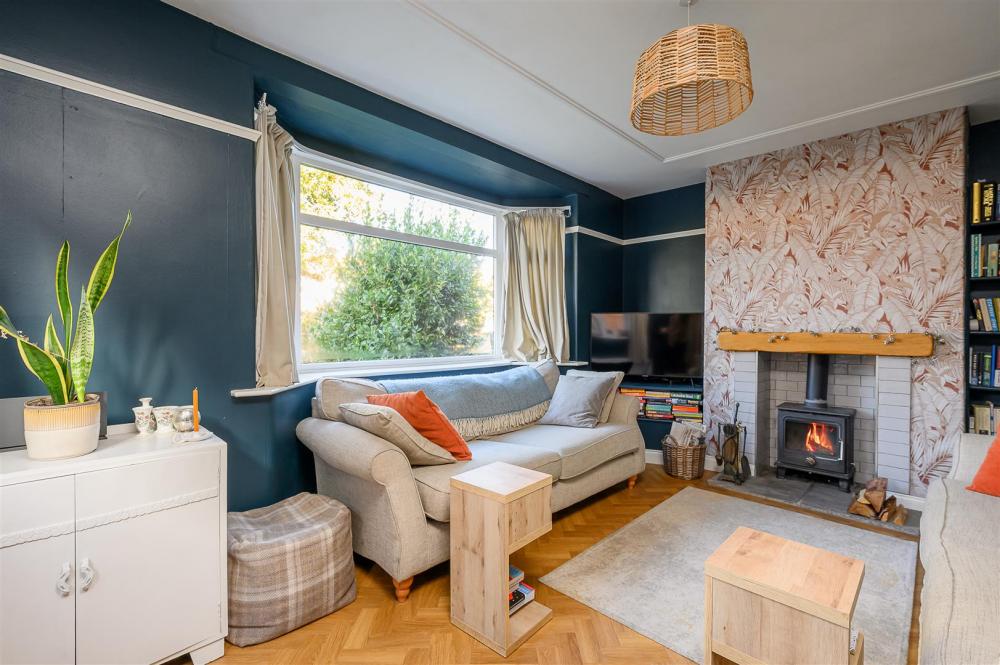A welcoming reception area with cloakroom off provides access to both the living room and kitchen. The spacious living room is positioned to the front of the house and features a bay window, parquet-style flooring, and a tiled fireplace housing a log-burning stove, with useful shelving to the side.