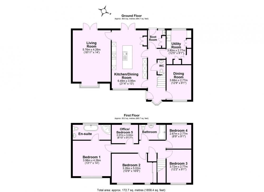 1st floor: 4 double bedrooms including main bedroom with modern en-suite that includes both a bath and shower cubicle. In addition, there is a house bathroom incorporating shower over the bath. There is an additional fifth single bedroom currently used for storage with potential for use as an office or nursery room. Airing cupboard housing water cylinder.
