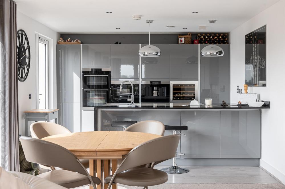 The apartment is approached via a secure communal entrance hallway, with a lift that opens into a private corridor, giving access into the apartment's central hallway (with useful storage cupboards) and double doors into the impressive, light and spacious L-shaped open plan living, dining and kitchen. Light floods into this room from two sides with a number of full height glazed doors and windows looking out to the terrace. The impressive kitchen area is separated from the main room by an island breakfast bar including a sink with Quooker tap and an induction hob with pop up extractor, whilst along the rear lie a superb range of units with integrated AEG appliances including a fridge freezer, dishwasher, double oven, coffee machine, microwave and wine fridge.