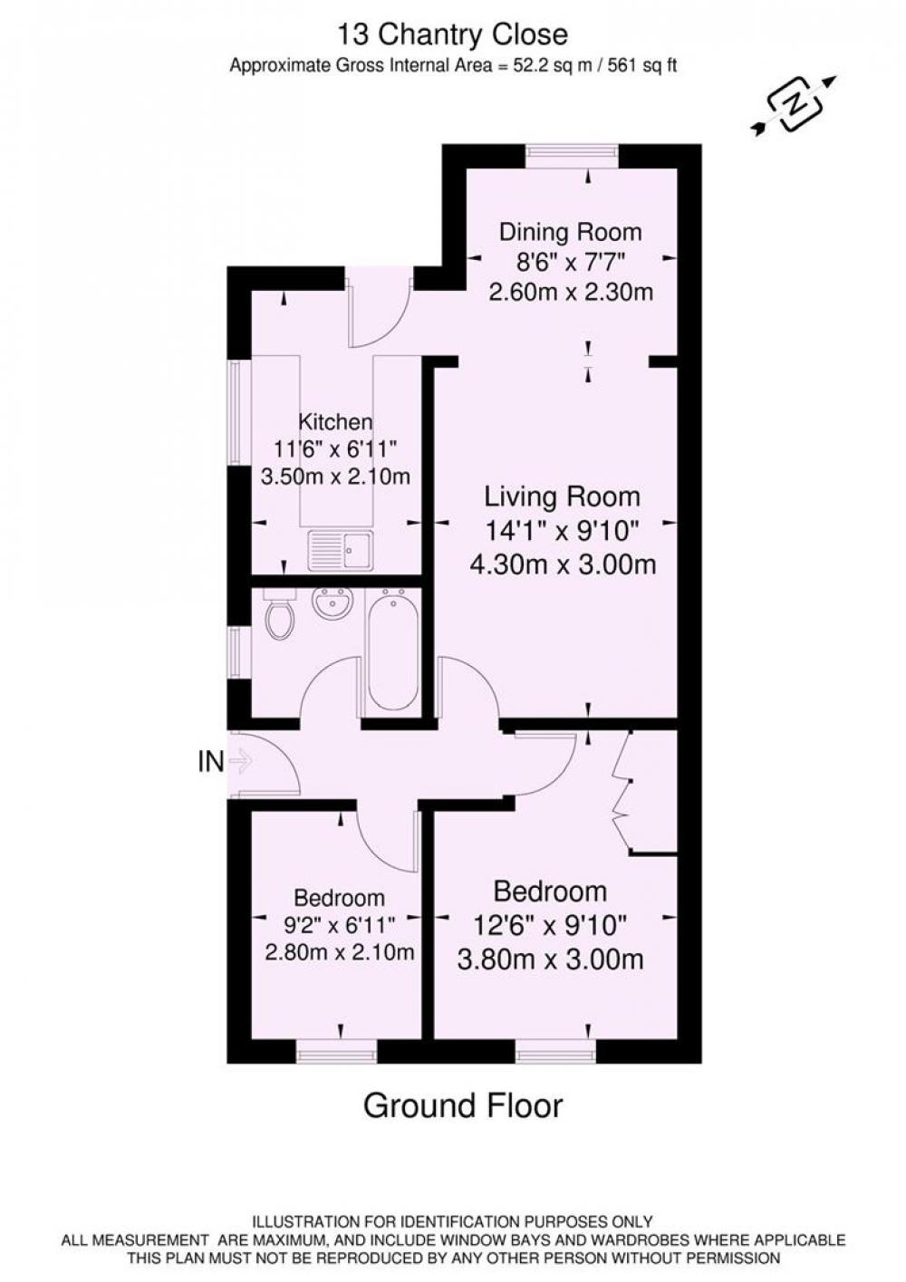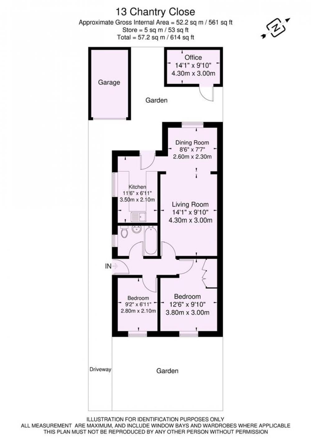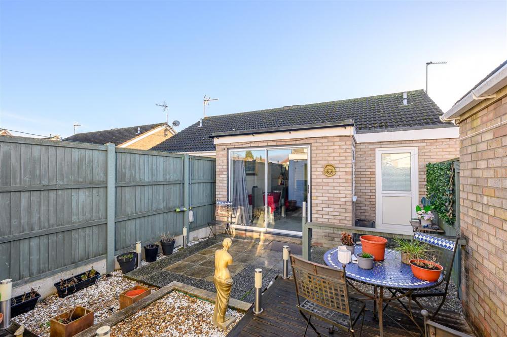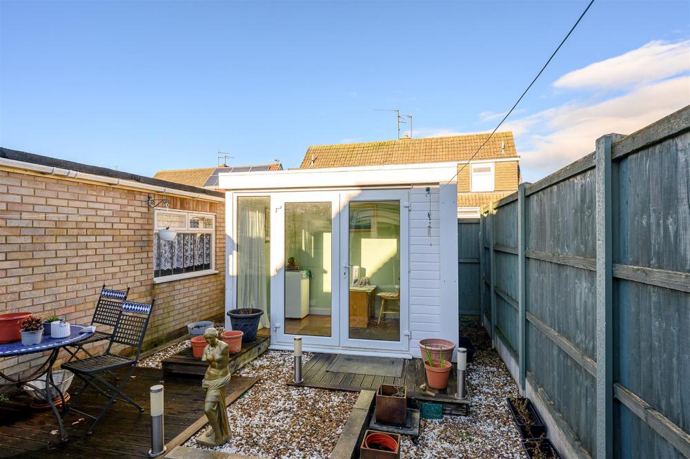 Both bedrooms are doubles, one with a fitted wardrobe, and are served by a modern white bathroom suite with a shower over the bath. To the rear is a low-maintenance garden with patio and gravel areas, along with a useful garden room.