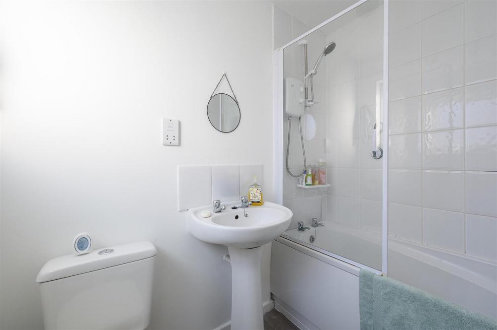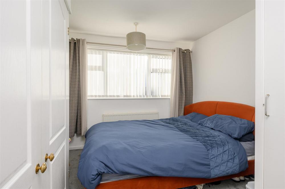 The bright living room features a white painted fireplace with electric fire and a wide picture window to the front. An archway leads to the dining area, which benefits from sliding patio doors to the rear garden. The kitchen offers a good range of white fronted fitted units, with space for a freestanding gas cooker, fridge and washing machine.