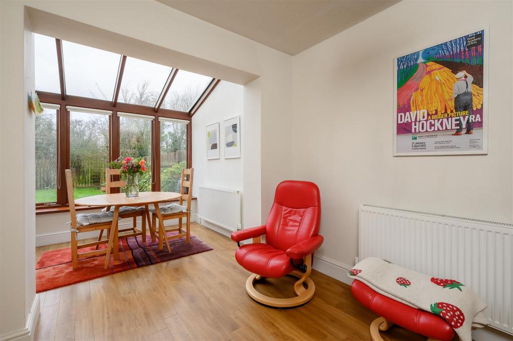 The side entrance opens into a spacious hallway providing access to the front living room, featuring a charming log-burning stove, as well as the kitchen, ground floor WC and integral garage. The recently fitted kitchen boasts a granite worktop with a range of modern units under offering integrated appliances, including a Neff dishwasher and double oven, along with space for a freestanding fridge freezer and washing machine. An open archway leads through to the extended snug and conservatory, creating a wonderful family living area with ample space for dining and entertaining.