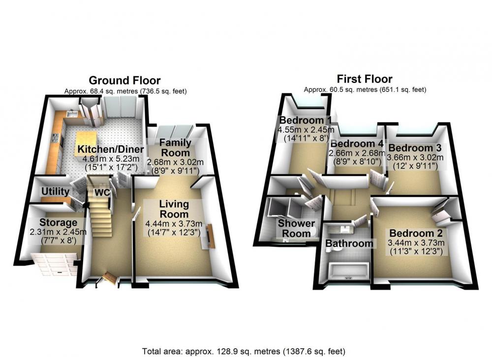 1st floor: 4 good sized bedrooms complimented by a house bathroom with shower over and a separate contemporary wet room style shower room positioned opposite the principal bedroom. The front bedroom benefits from a fitted wardrobe.