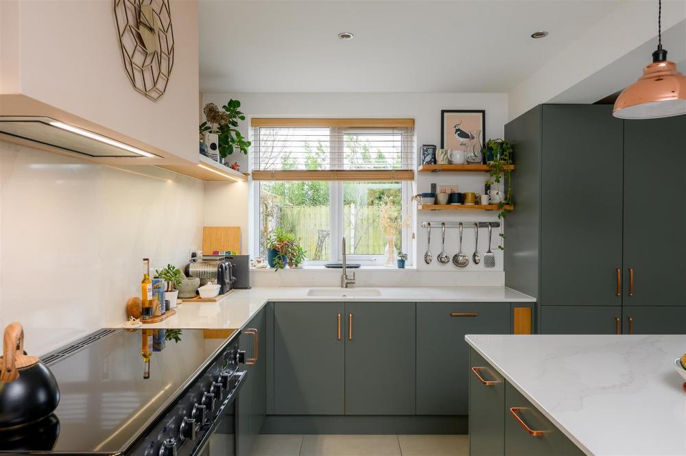 A welcoming entrance hall with engineered Oak flooring continues through to a good-sized living room housing a multi-fuel burning stove, set on a slate hearth with open archway leading through to a family room/snug beyond, which benefits from sliding French doors enjoying garden views. Adjacent to the family room is a superb 'Open Plan' kitchen diner with central island incorporating breakfast bar and Silestone worktops. Integral botanical green coloured units include tall standing fridge freezer, pantry cupboard finished in Oak interior, Rangemaster oven with induction hob and extractor over, plus a dishwasher. Tiled flooring. Sliding French doors provide garden access. Off the kitchen is a useful utility room which includes a microwave, with space for a washing machine, plus integral garage store access. The store includes a Belfast style sink with hot and cold-water taps. Ground floor WC -- under-stairs storage.