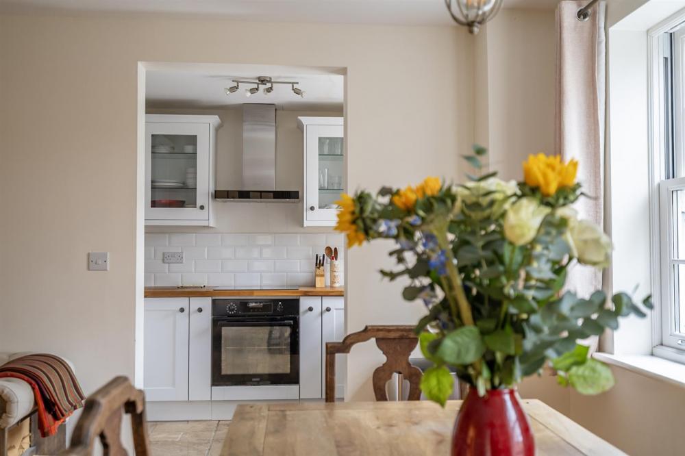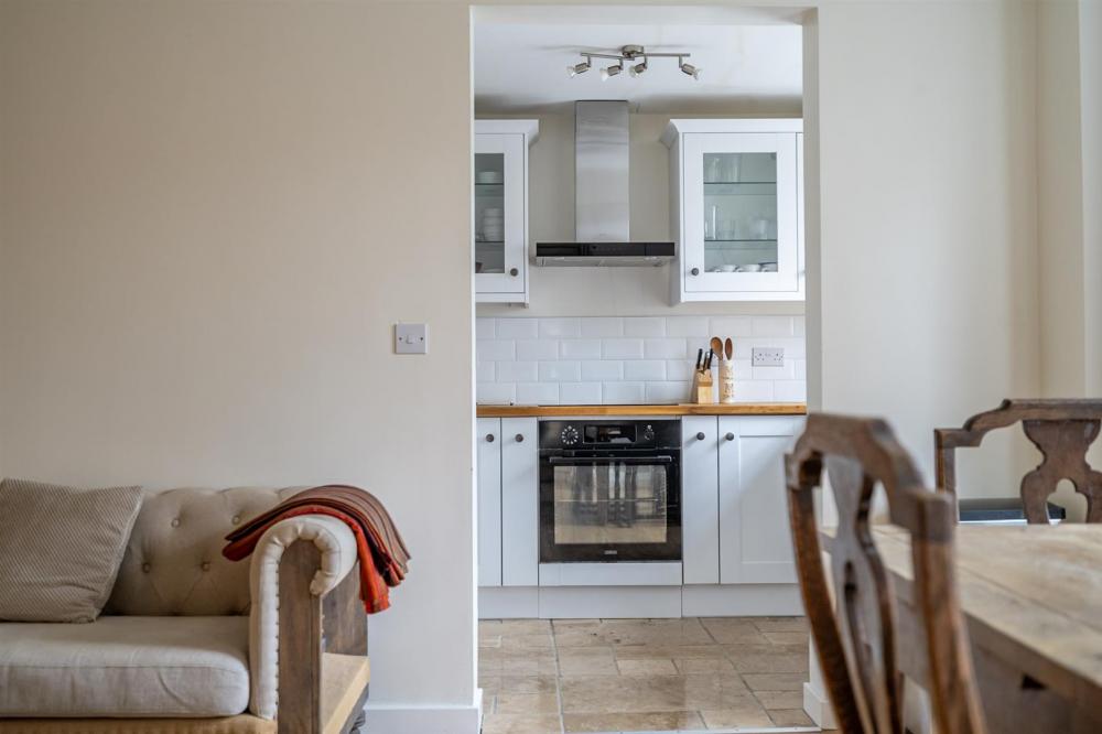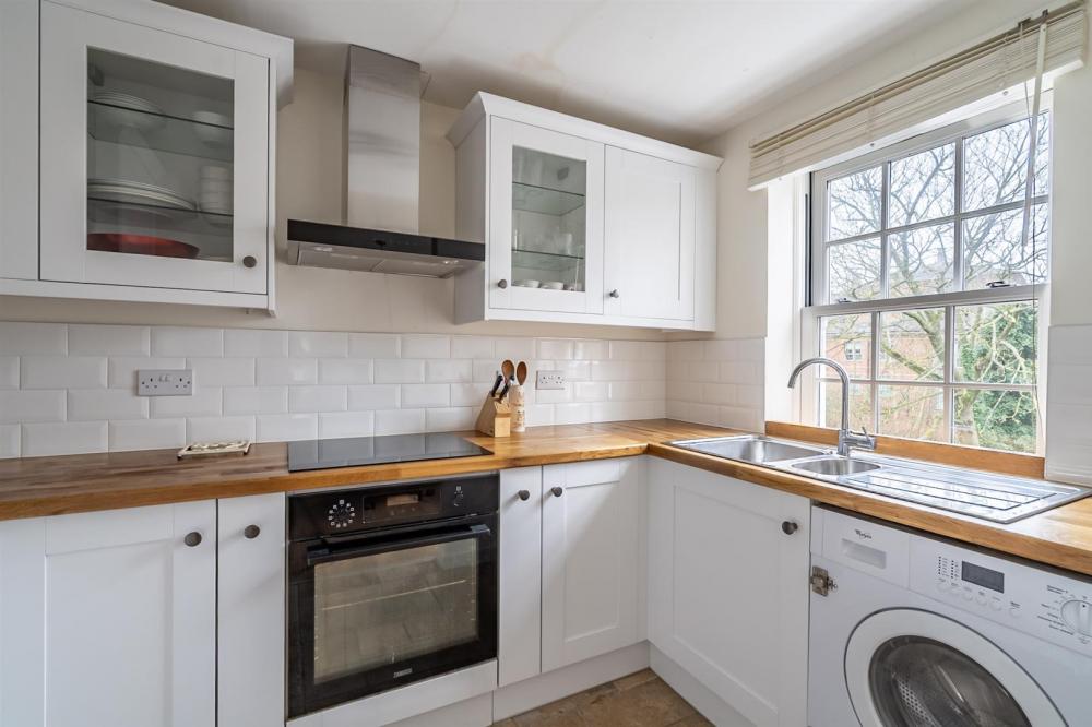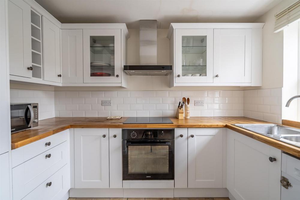 The kitchen is accessed via an archway from the living area and is well appointed with a good range of fitted units with solid oak countertops and integrated appliances including an oven, hob with extractor, fridge/freezer and washing machine.