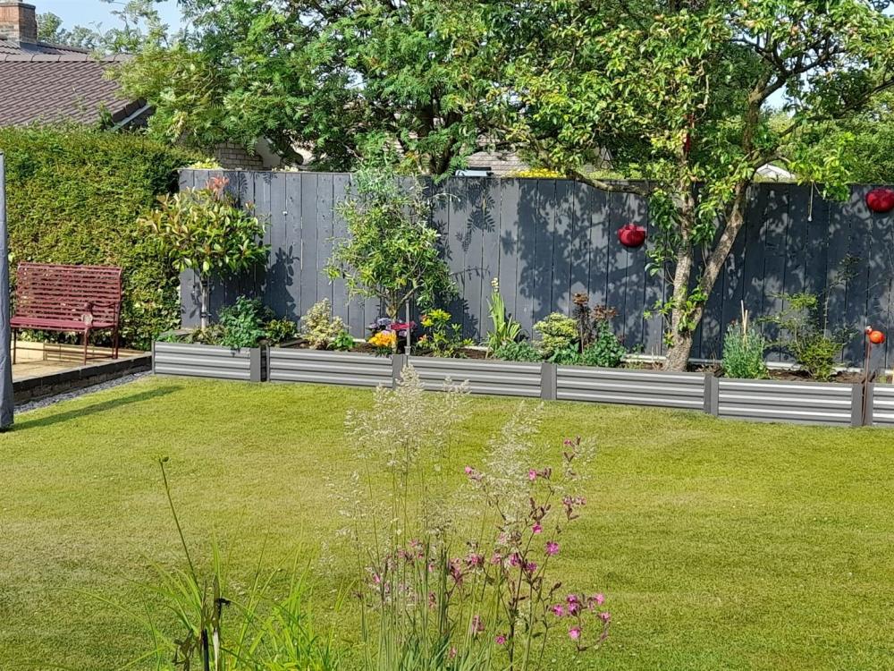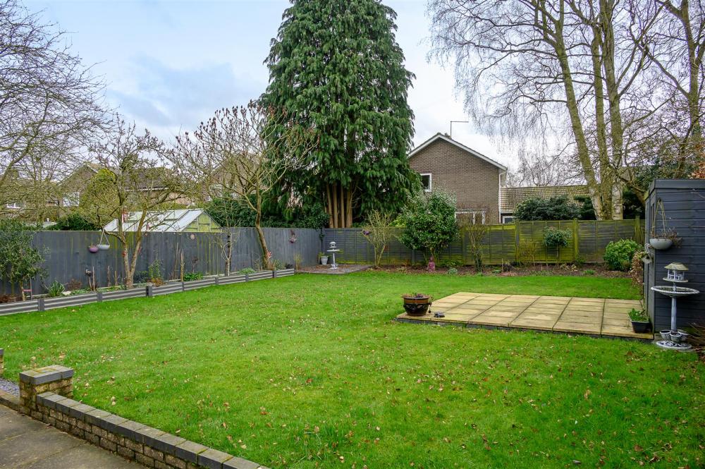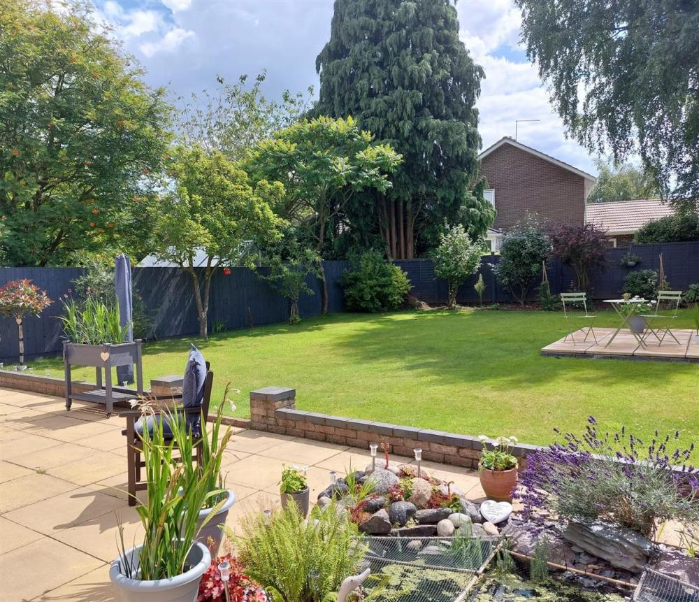 To the rear, the south-facing landscaped garden features patio seating areas, a well-kept lawn, planted borders, and two timber sheds.