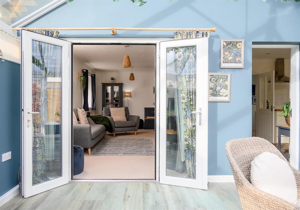 The bright, modern kitchen features a range of stylish fitted units with integrated appliances, including an eye-level oven/grill, ceramic hob, and the added luxury of underfloor heating. Double doors open into the impressive living room, complete with a feature fireplace, which flows seamlessly into a large conservatory currently used as a dining area. Also benefitting from underfloor heating, this exceptional additional space allows for comfortable year-round use while enjoying lovely views over the garden.