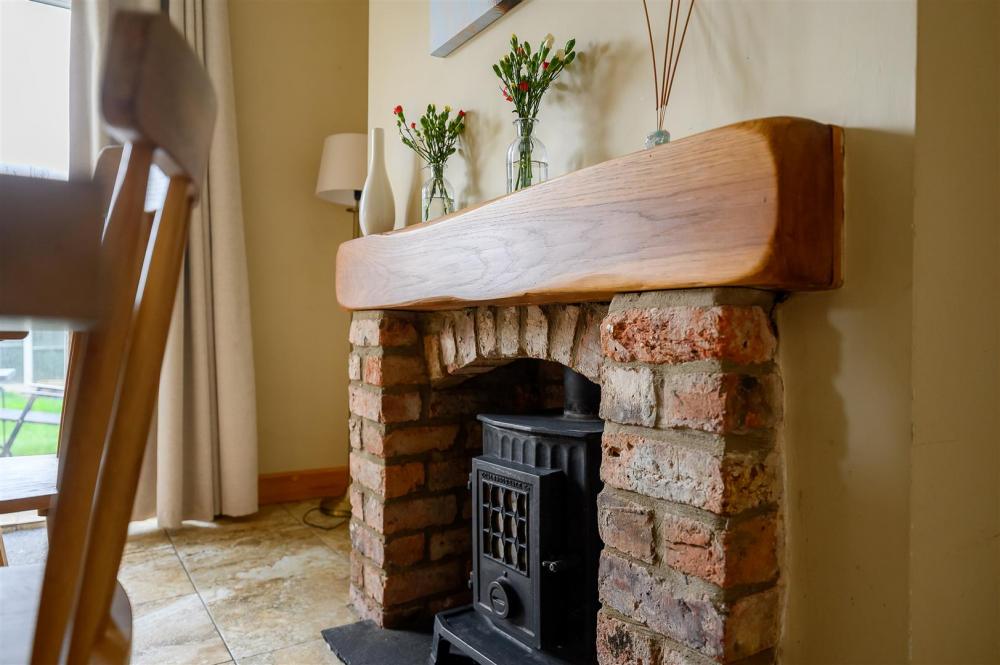 The lounge features a bay window and brick fireplace with a log-burner-style electric stove, while the open-plan kitchen and dining area boasts contemporary units, integrated appliances, wooden worktops, a breakfast bar, and patio doors opening onto a generous rear garden – ideal for entertaining.