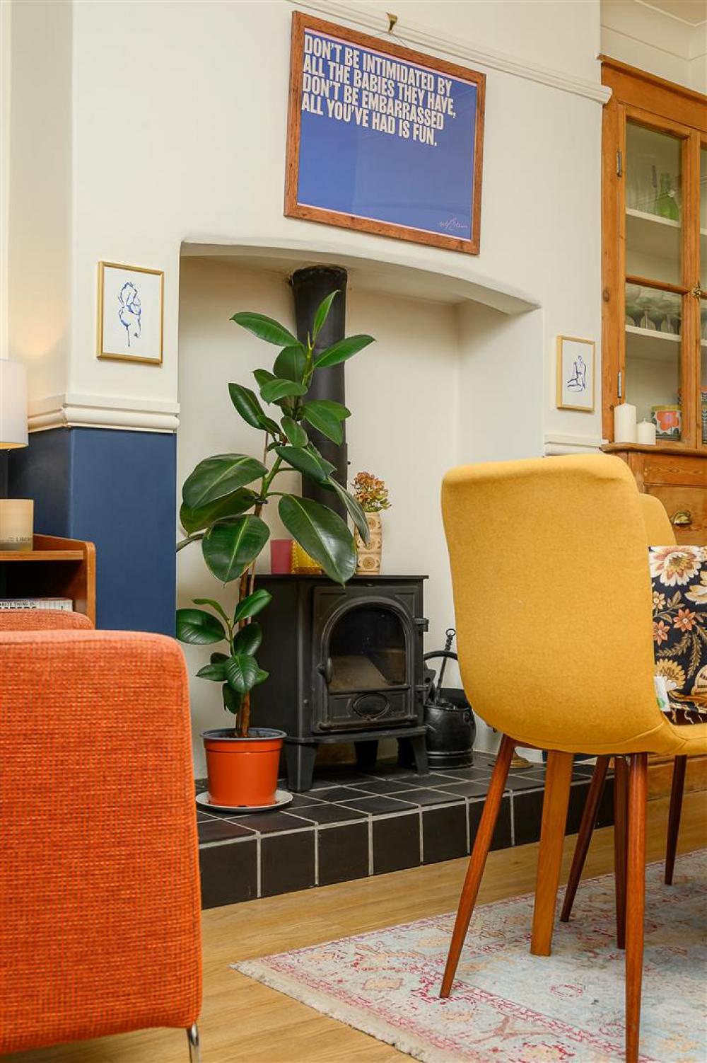 The front living room is bright and inviting, with a wide bay window, picture rail, coving, and a Victorian-style fireplace with open fire. To the rear, the separate dining room features a log-burning stove, tiled hearth, and an original built-in dresser.