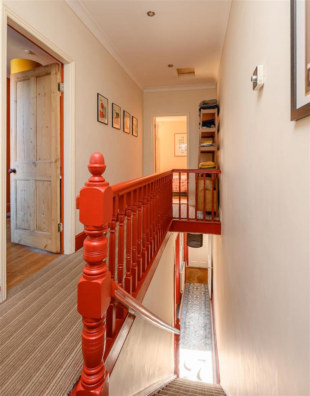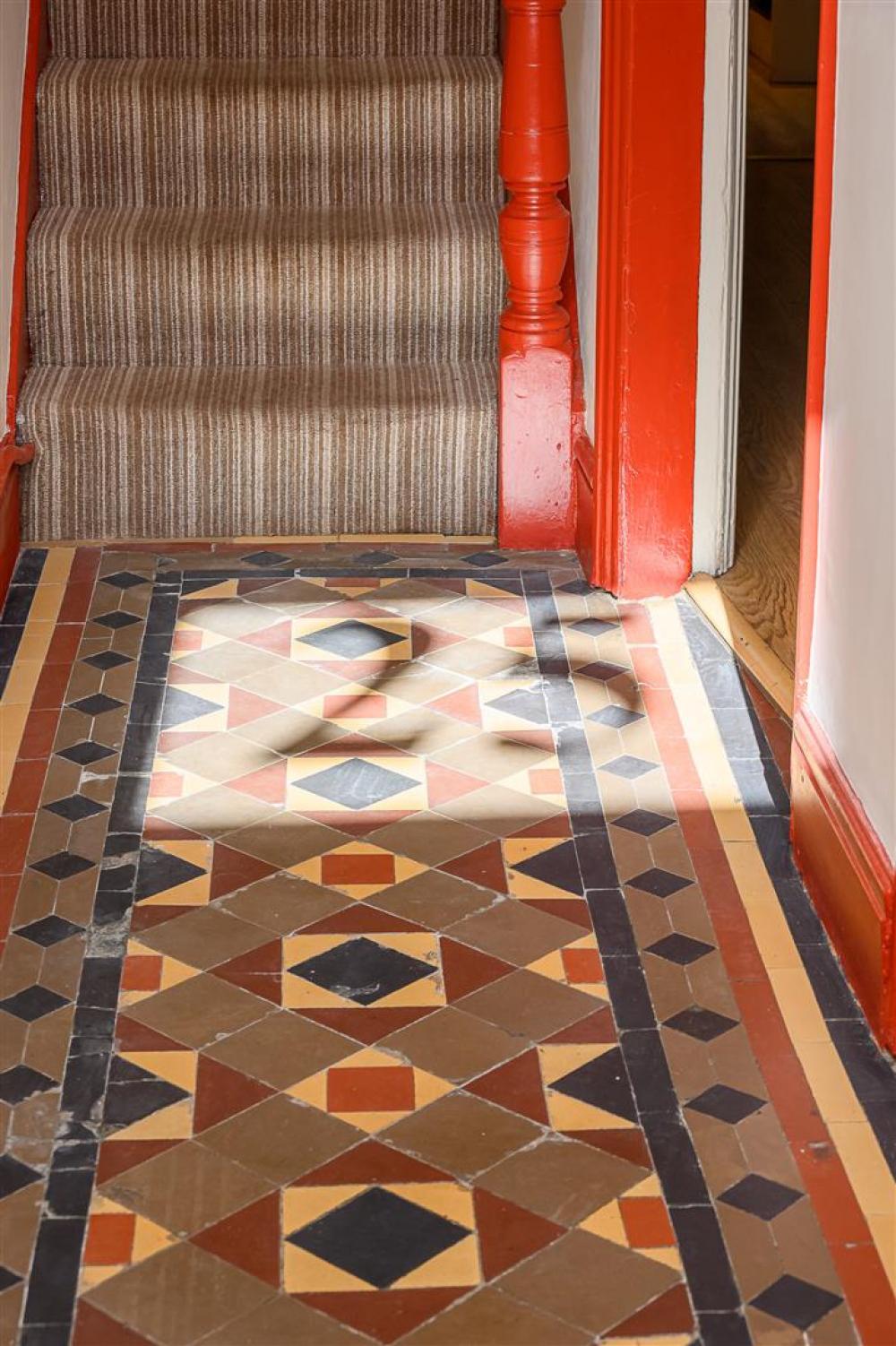 This characterful home welcomes you through a pretty pink front door into a tiled vestibule and spacious hallway showcasing original mosaic flooring and stripped pine doors.