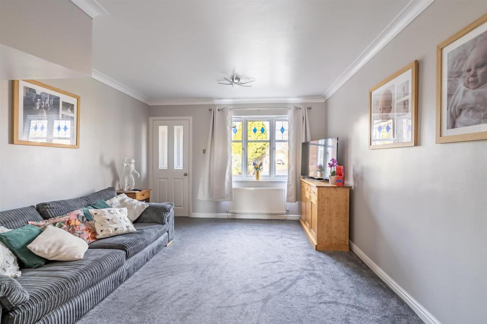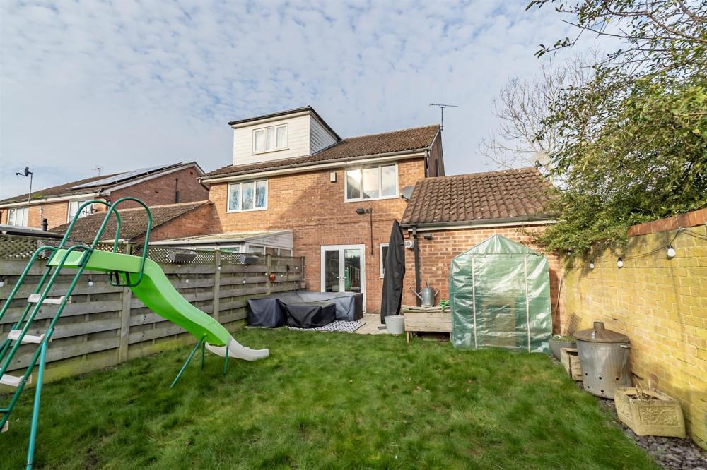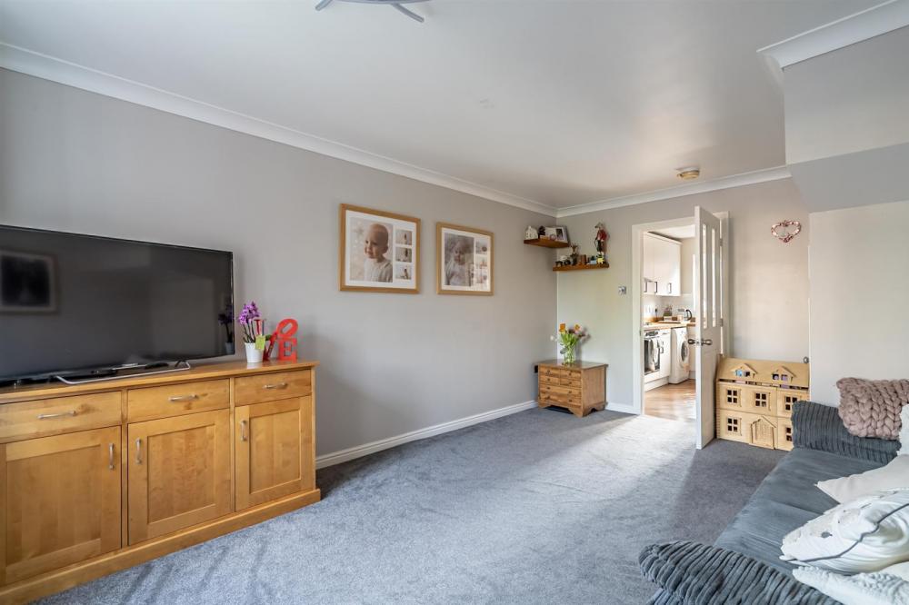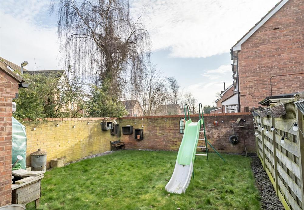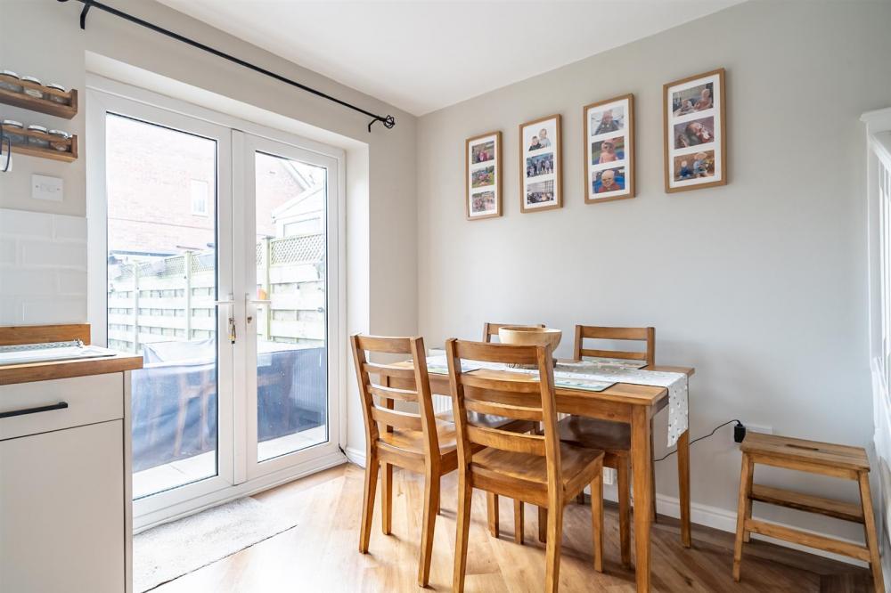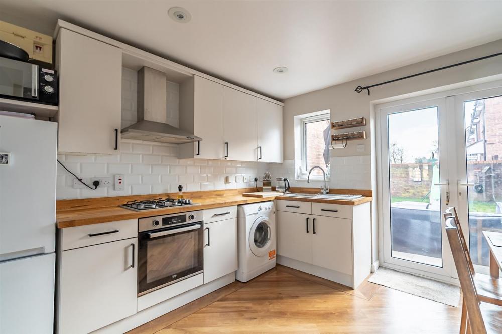 The ground floor offers a generous living room, which leads through to the rear kitchen diner. The kitchen is fitted with a range of contemporary wall and base units, integrated cooker and gas hob, with extractor over, along with space for a washing machine and fridge freezer. A staircase leads up to the first floor and patio doors open out to the walled rear garden, with lawn and patio area.