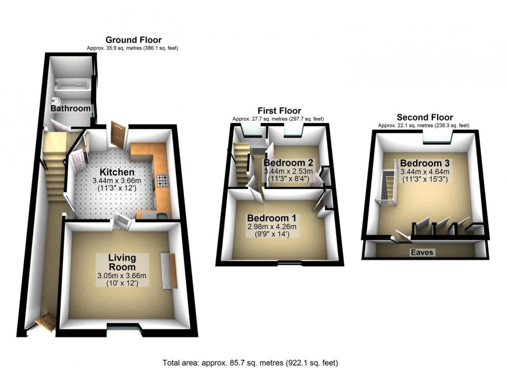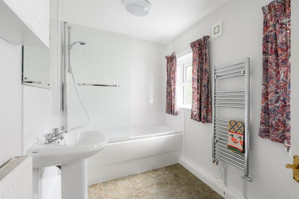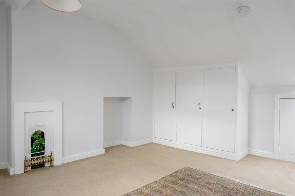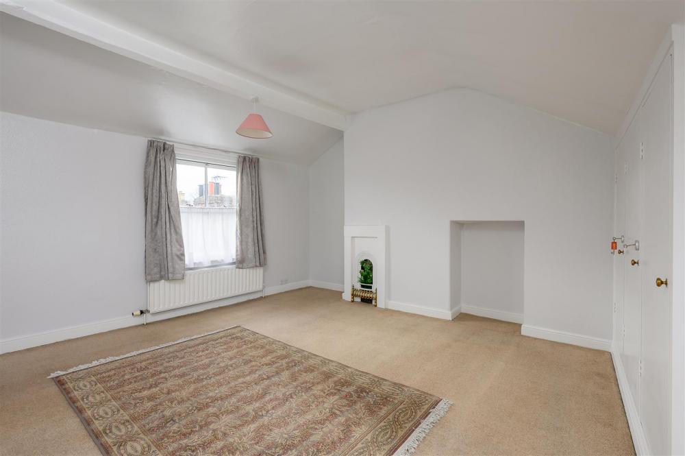 The first floor comprises two well-sized bedrooms, both with wall cupboards, along with a handy storage cupboard on the landing. The staircase continues to the second floor, where an impressive loft conversion creates a spacious principal bedroom. This lovely room features a range of fitted wardrobes, a charming original fireplace, practical eaves storage, and abundant natural light from both a window and a skylight.