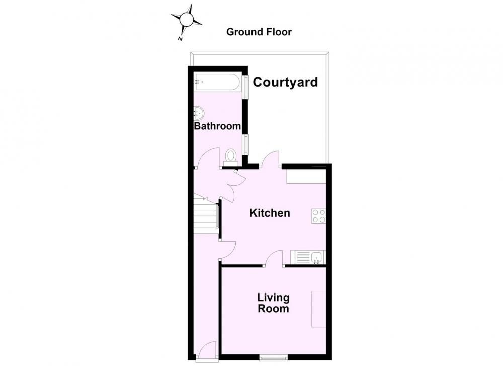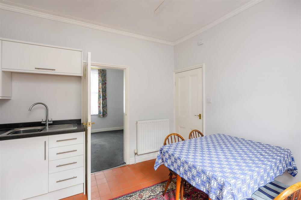 A street-level entrance opens into a welcoming hallway, with stairs leading to the first floor and access to a spacious dining kitchen. The generously proportioned kitchen comfortably accommodates a dining table and features a range of white-fronted units, an integrated oven, ceramic hob with extractor hood, and space for freestanding appliances. Characterful quarry-tiled flooring complements the room, and a door opens onto the rear courtyard. From the kitchen, a bright and inviting living room awaits, enhanced by a large sash window and an original Victorian cast-iron open fireplace with decorative tiled inserts. A small lobby off the kitchen provides access to the ground-floor bathroom, fitted with a white suite and a shower over the bath.