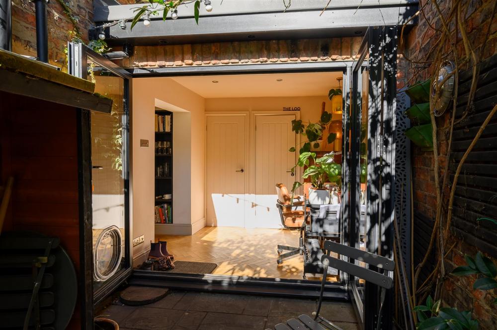 The ground floor is completed by a versatile seating area or home office, which opens through bi-fold doors onto a private patio and courtyard garden.