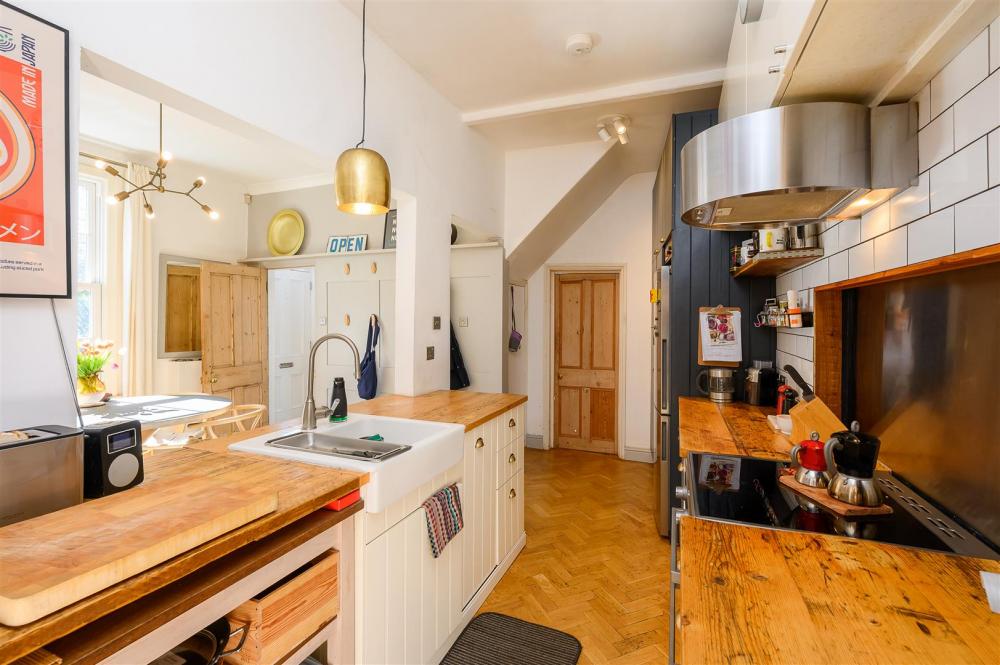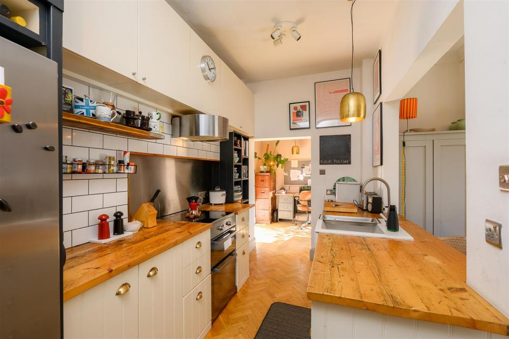 Opposite the reception area is the dining room, which also benefits from a sash window overlooking Fairfax Street, elegant parquet flooring, and a second period fireplace with an open fire. To the rear, accessed via a wide arched serving opening, is a generous galley-style kitchen. The kitchen is fitted with a range of bespoke units, timber worktops, and offers space for a freestanding cooker and fridge/freezer.