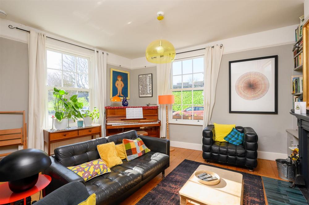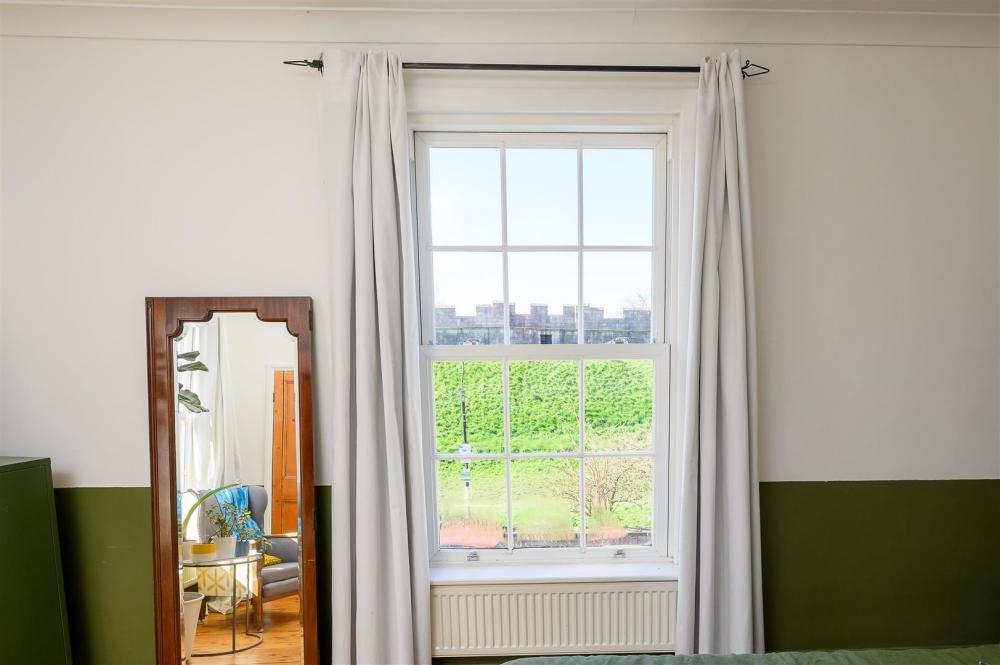 The front entrance, located on the corner of Fairfax Street, opens into a welcoming reception vestibule, leading through to a spacious living room. This cosy space features timber flooring, a charming period fireplace with an open fire, and dual-aspect Georgian-style sash windows overlooking the historic City Walls.
