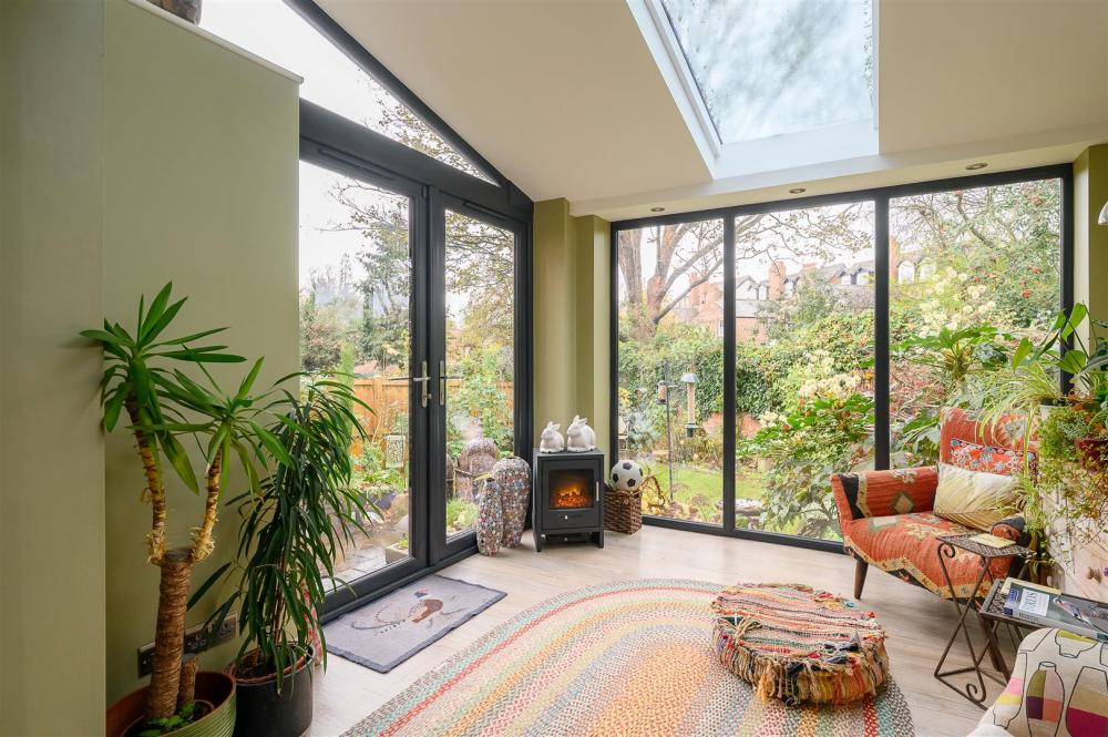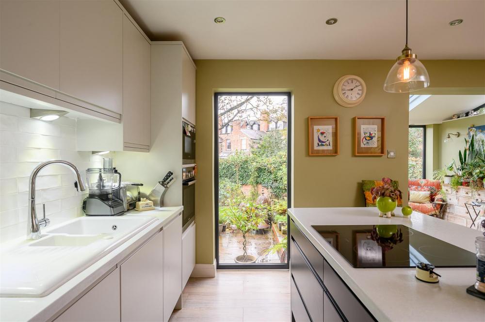 To the rear of the property the kitchen dining room has been extended and offers a great family or entertaining space, with floor to ceiling windows and doors opening onto the garden, creating a seamless indoor-outdoor feel. The kitchen features an integral fridge freezer, dishwasher , eye level oven, microwave and induction hob, complete with central island offering extra storage