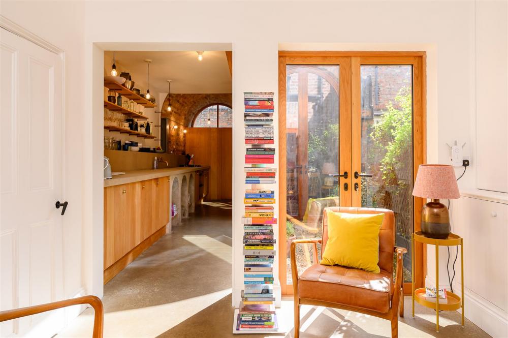 Internally a well appointed living room lies to the front of the home, taking in views over the charming cottage-style front garden, and boasting high ceilings, feature fireplace and fitted plantation shutters. Continuing through, you are welcomed into the main living accommodation- A cosy sitting room and open plan kitchen dining room are beautifully framed around a central courtyard drawing the outdoors in and allowing light to flow through. The sitting room offers ample integral storage and multi fuel stove whilst the unique, bespoke kitchen is well equipped with storage, integral appliances and a stunning polished concrete worktop.