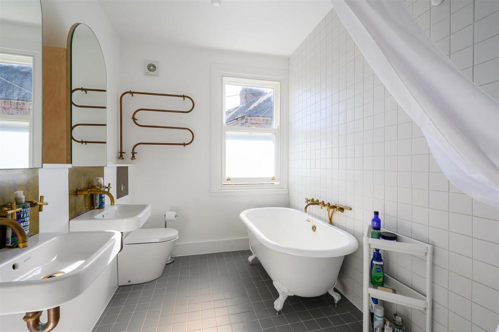 To the first floor, the largest of the bedrooms lies to the front with dual aspect windows, built in wardrobes and window seat. There is a second double bedroom and a generously sized family bathroom with claw foot bath, shower and dual sinks, complimented by brass furnishings.