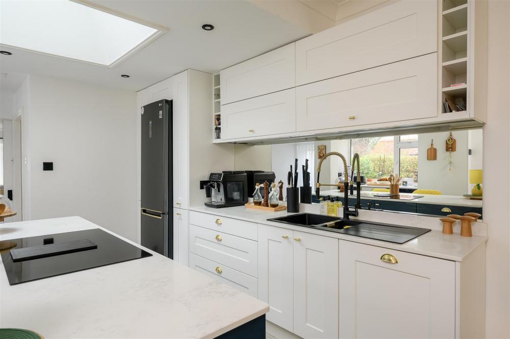 The true heart of the home is the stunning open-plan dining kitchen, flooded with natural light and thoughtfully designed for modern family living. The kitchen is fitted with a range of contemporary white units, complemented by a central island breakfast bar incorporating a ceramic hob. Integrated appliances include two low-level ovens, an integrated dishwasher, with ample space for a family dining table. The kitchen also provides access to the rear garden, a convenient ground floor toilet, and sliding double doors opening into the spacious living room, creating an ideal space for both entertaining and everyday living.