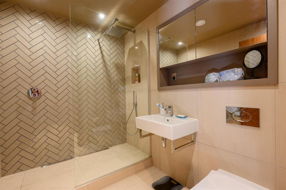 The internal accommodation boasts a beautiful open plan kitchen dining and living room. Complete with modern features such as recessed lighting and underfloor heating, this great space is perfect for entertaining or simply relaxing on the terrace. The kitchen includes soft close base and wall units, integral dishwasher, microwave, induction hob, oven, fridge and freezer, together with a useful walk in pantry. In addition, the current owner has customised the interiors by creating bespoke shelving within the kitchen island unit and additional useful storage within the dining area.