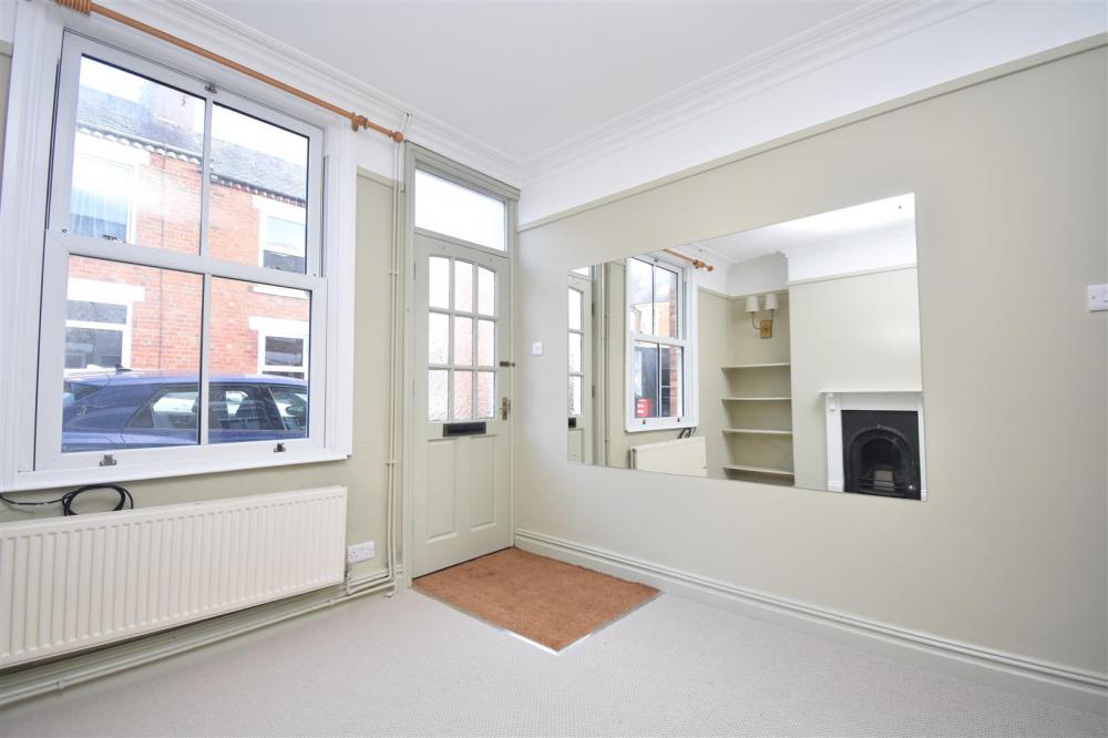 Door leading straight into lounge, original varnished floorboards, feature fireplace, double glazed sash window & curtains, double panel radiator, wall length mirror.
