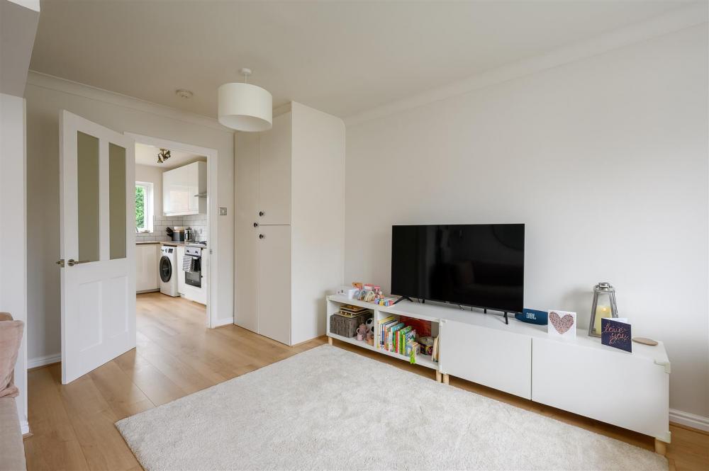 The property is approached via a front garden, with driveway parking conveniently located to the side. An entrance porch leads into the main living space, where the bright and airy living room benefits from useful built-in storage cupboards. From here, the room flows through to the kitchen at the rear of the property, with stairs to the first floor.
