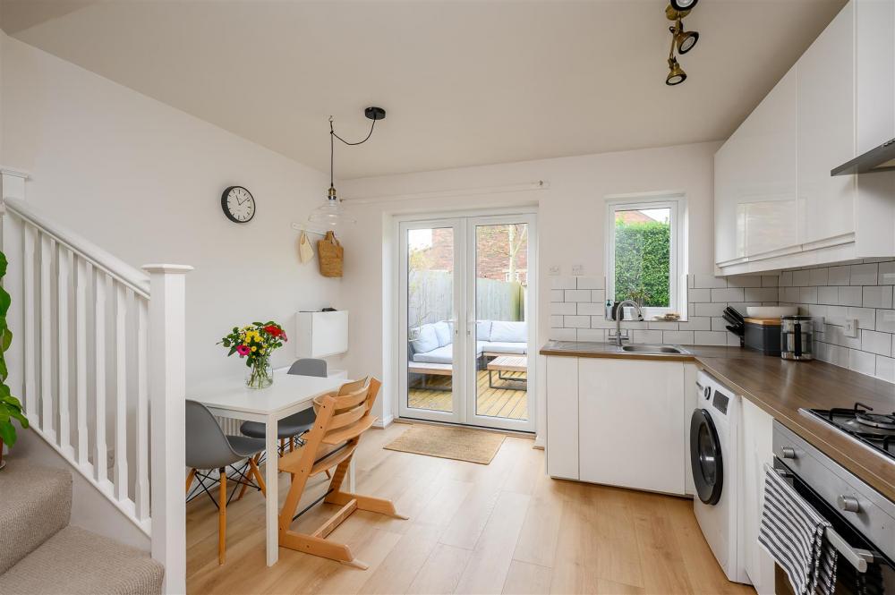 The kitchen is fitted with modern wall and base units complemented by wood-effect worktops, and includes integrated appliances such as a fridge freezer, oven and gas hob with extractor above. There is ample space for a dining table, making it a sociable kitchen-diner, while patio doors open out onto the rear garden, allowing plenty of natural light and easy access to outdoor space.