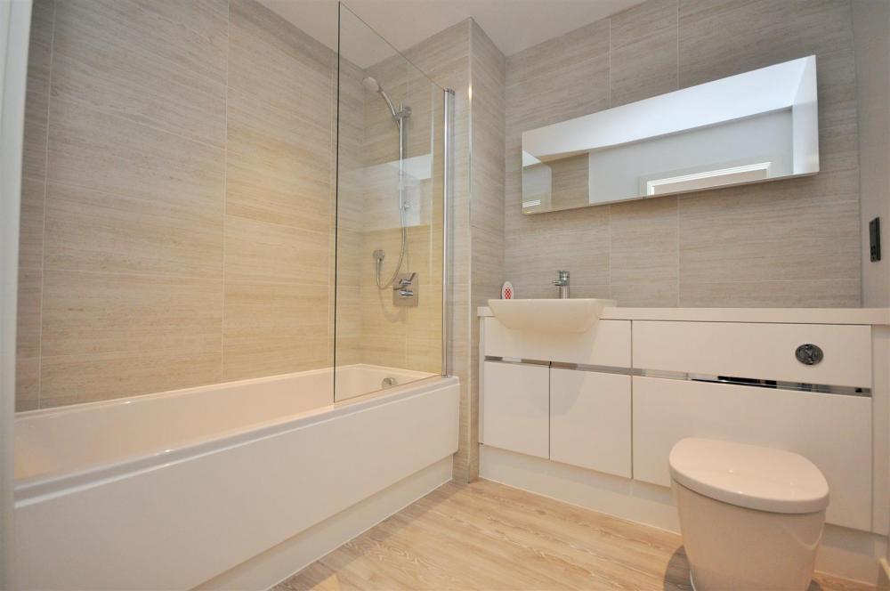 White suite comprising panelled bath with shower over, wash hand basin set into a vanitory surround with cupboard under and a low flush WC. Chrome ladder style heated towel rail. Shaver point. Recessed spotlights.