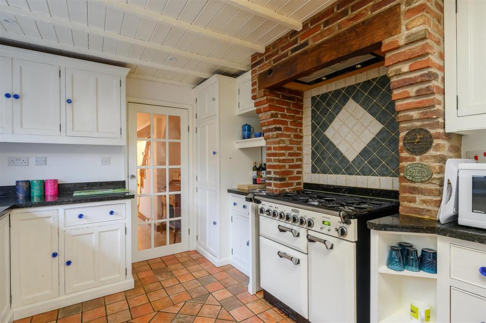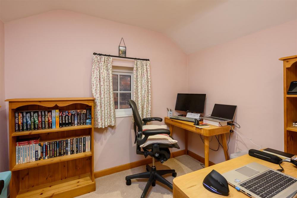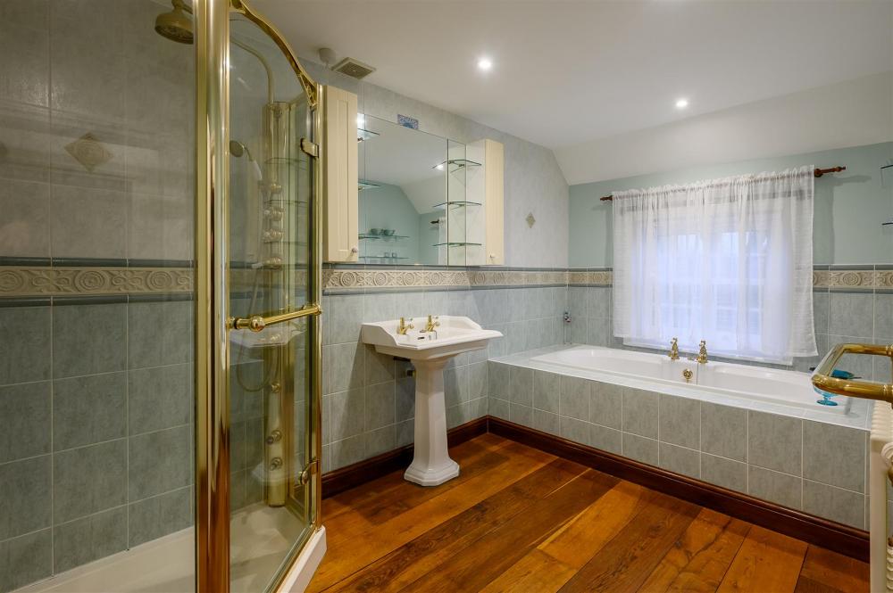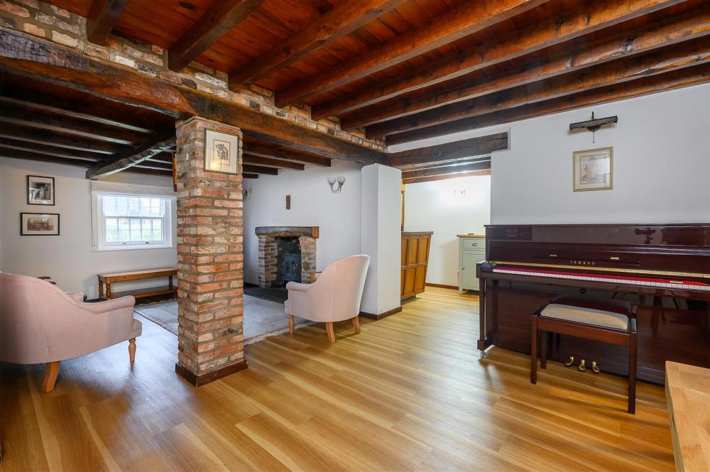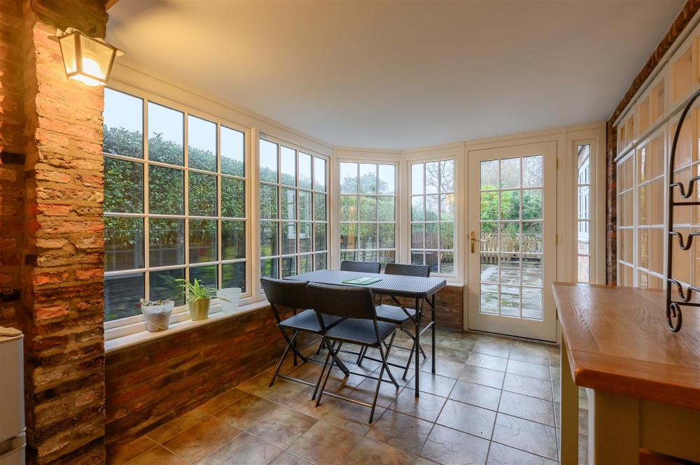 The property has been thoughtfully maintained and sympathetically enhanced over the years, creating generous and versatile living spaces throughout. Accessed via the front or side entrance, the impressive living room features wood style luxury vinyl tiles and a beamed ceiling, complemented by a brick fireplace with gas stove. French doors from the living room open into the garden room, providing natural light and close connection to the outdoors. Adjacent to the living room is a reception room/study with storage cupboard, ideal for home working. The farmhouse-style kitchen offers ample storage and space for appliances, including a range cooker, and can be accessed from the dining room, living room or garden room. Completing the ground floor is a double bedroom to the rear, benefiting from an en-suite.
