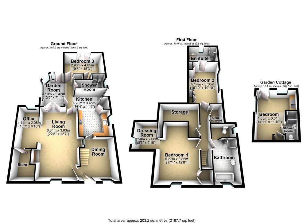 The first floor comprises a spacious master bedroom with dressing area, a house bathroom, a further double bedroom with en-suite, and a large storage cupboard on the landing.