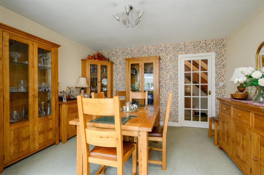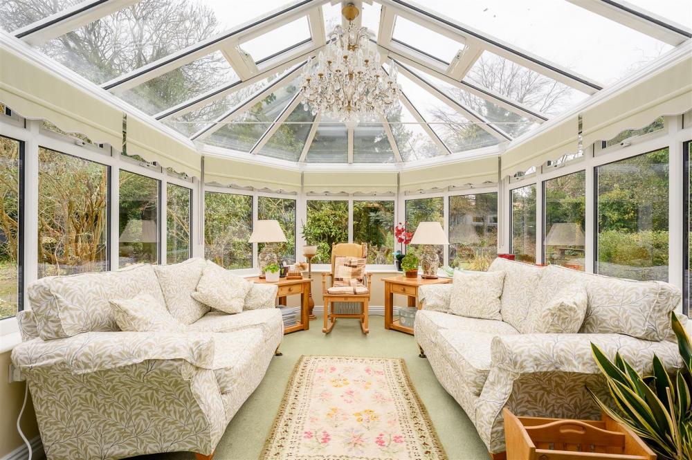 A dining room has sliding doors leading to a large conservatory, offering views over the rear garden and doors opening to the garden.