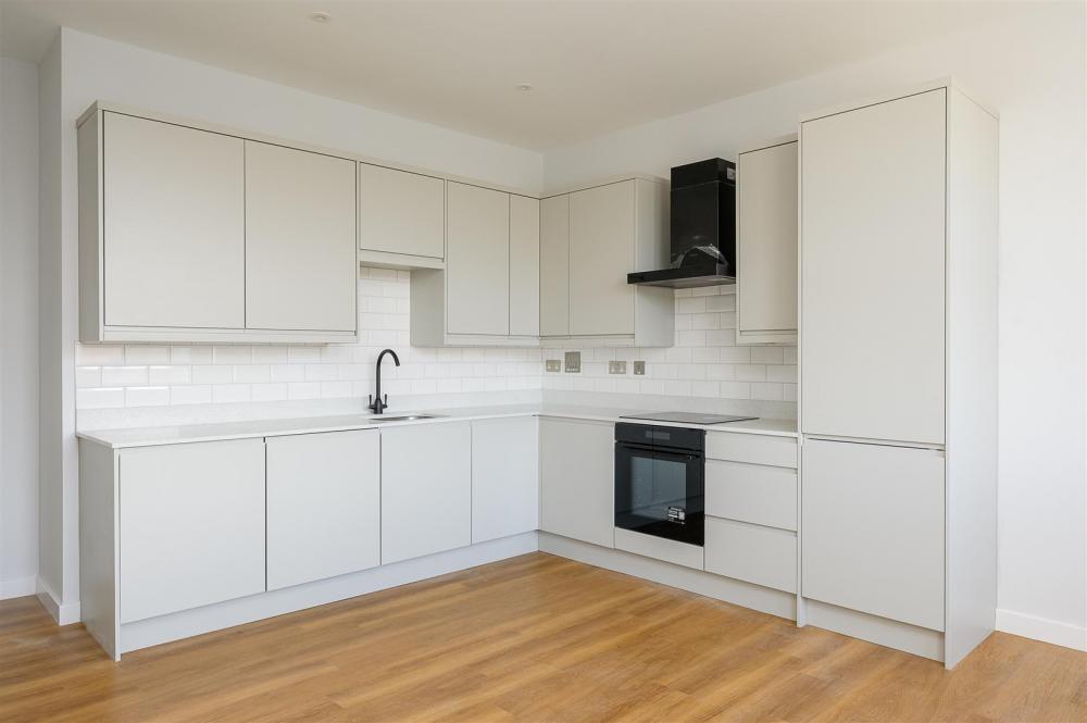 To the opposite side of the apartment, you’ll find the open-plan living area, finished with Amtico flooring and fitted with datapoints for modern connectivity. The contemporary corner kitchen is equipped with white-fronted units, quartz worktops, and a full range of integrated Hager appliances, including a fridge/freezer, washing machine, dishwasher, electric oven, ceramic hob, and extractor hood.