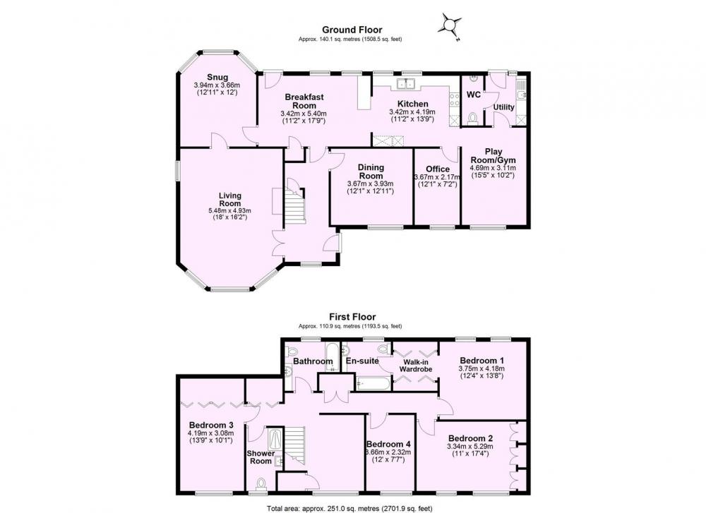 Accommodation includes: a storm porch leading into an impressive entrance hall with Herringbone pattern Oak flooring -- dining room -- lovely 'open plan' kitchen breakfast room with multiple windows enjoying garden views. The bespoke handmade kitchen benefits from granite tops; incorporating American style fridge freezer, dishwasher, double oven/grill, microwave, plus an electric hob with extractor over -- office -- playroom/gym including coats cupboard -- utility/boot room with cloakroom off -- snug with bay window enjoying garden views -- lovely large living room with open fireplace set on a marble hearth with pine surround and front garden views. To the first floor: large landing (potential 5th bedroom) -- 4 bedrooms -- main bedroom includes en-suite bathroom plus extensive fitted wardrobes -- guest bedroom with adjacent shower room -- house bathroom -- landing storage cupboards -- airing cupboard.