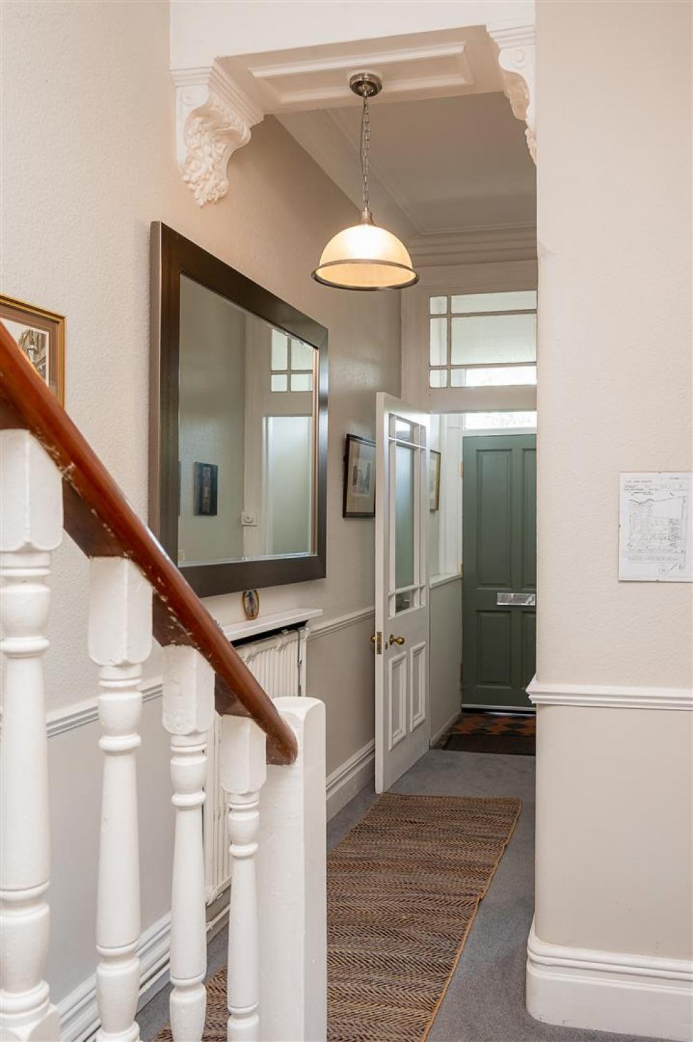From the moment you step inside, the sense of space is immediately apparent. The wide and welcoming entrance hall leads to two principal reception rooms: a stylish front-facing living room with a feature fireplace and bespoke double-glazed sash windows, and a separate dining room that flows into the large kitchen.