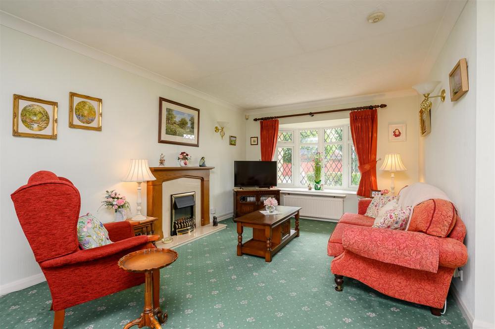 The hallway leads to the impressive main reception room, featuring a bay window to the front and sliding patio doors opening into the conservatory. This arrangement floods the space with natural daylight. A stylish modern fireplace with electric fire forms the focal point of the living room, while the tiled conservatory provides additional seating and direct access to the rear garden—perfect for entertaining.