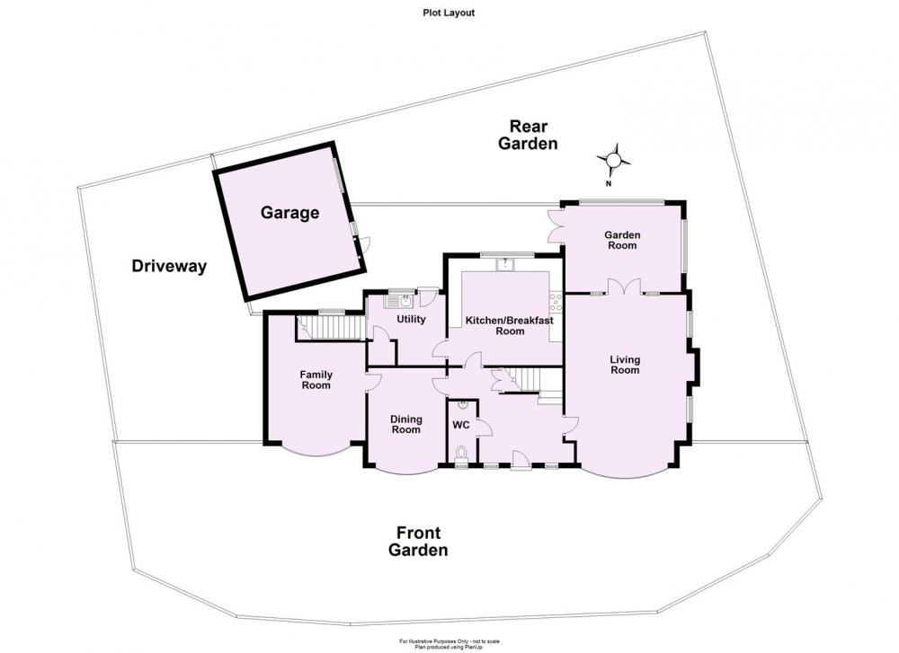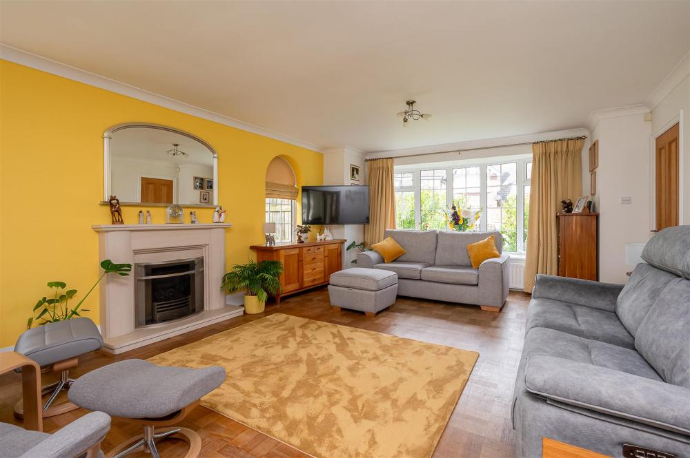 To the left of the entrance hall lies a separate dining room, beyond which is a further family room with a wide bay window.