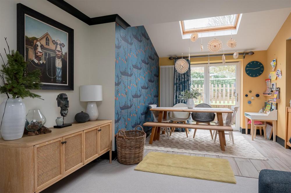 Stepping inside, the welcoming entrance hallway provides access to a useful ground-floor W/C and leads through to a bright and spacious front lounge, where a large bay window fills the room with natural light. To the rear of the house, the impressive open-plan kitchen, dining, and snug area serves as the heart of the home. Featuring modern wall and base units, integrated appliances, a generous island, and a log-burning stove. This space is perfect for both everyday family life and entertaining. Skylights and two sets of bi-fold doors enhance the sense of space and light, seamlessly connecting the indoors to the south-facing rear garden. A large utility room provides additional storage and space for a washer and dryer.