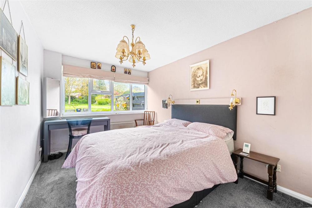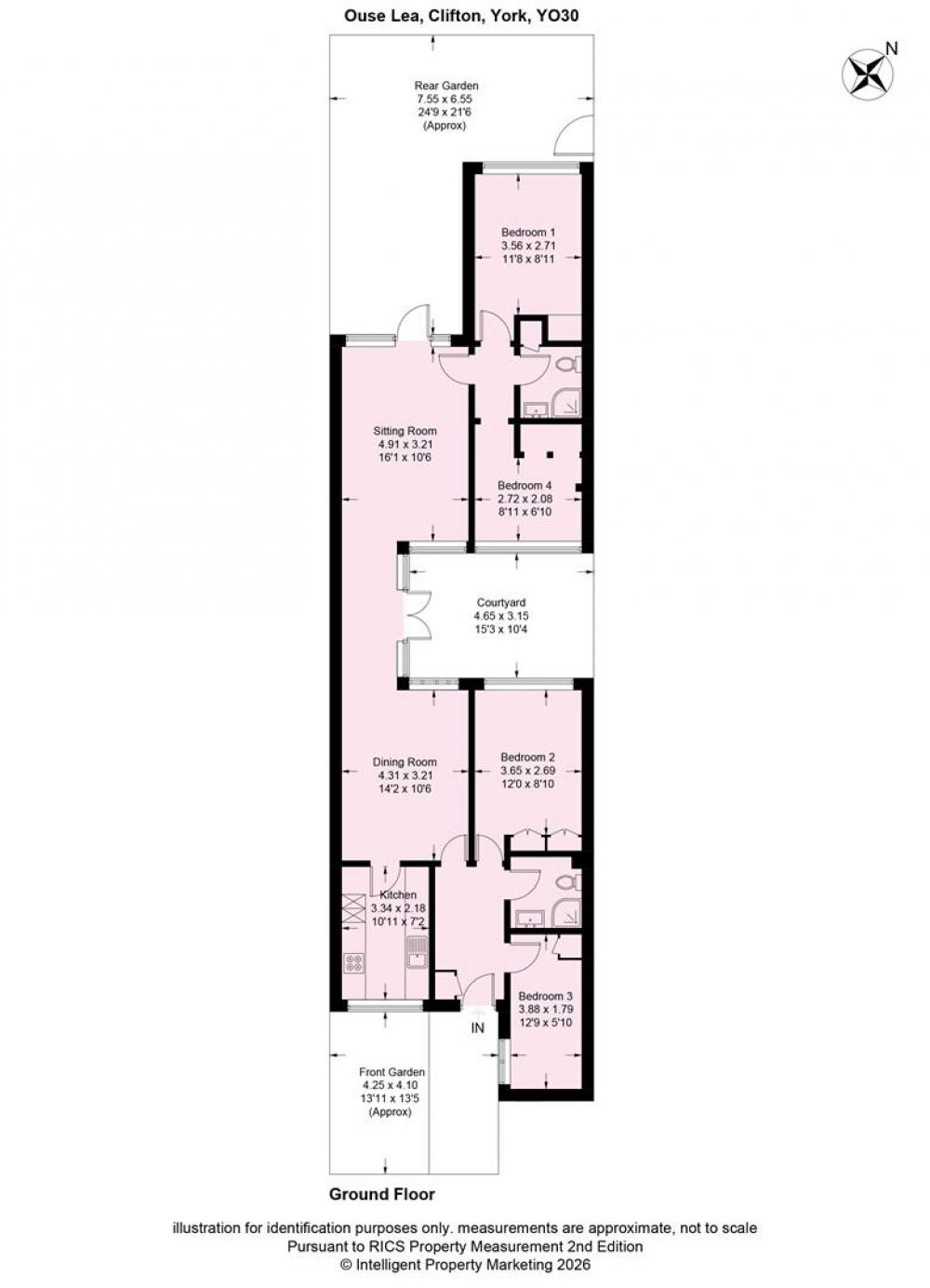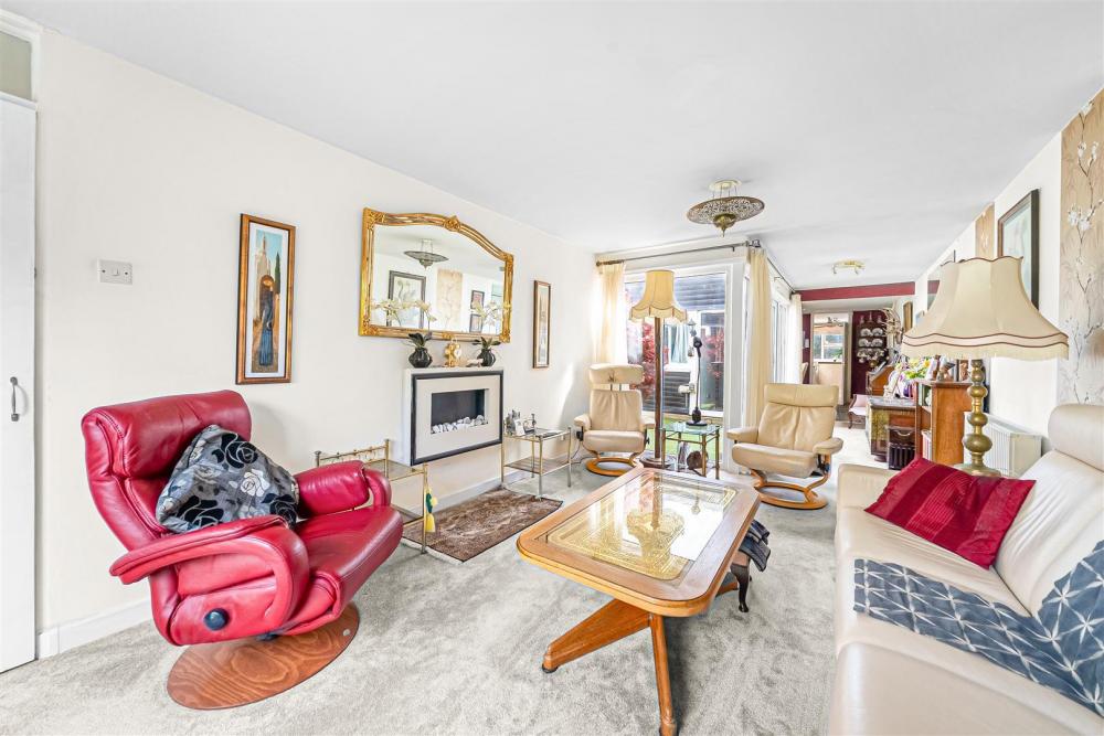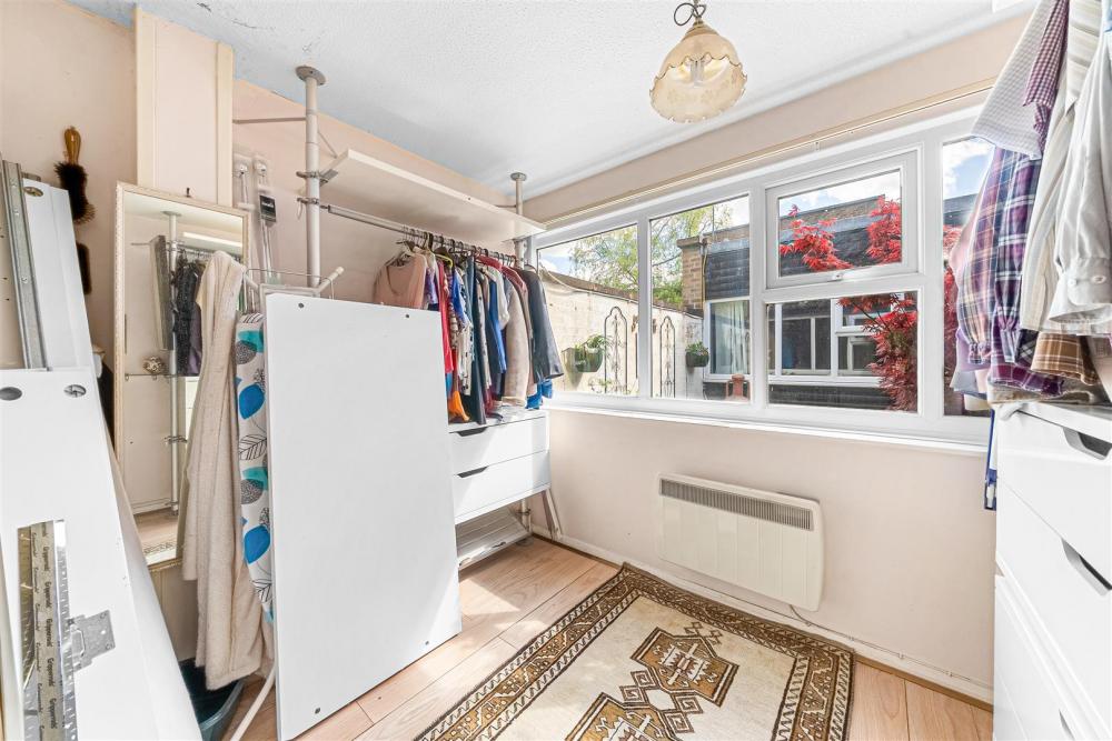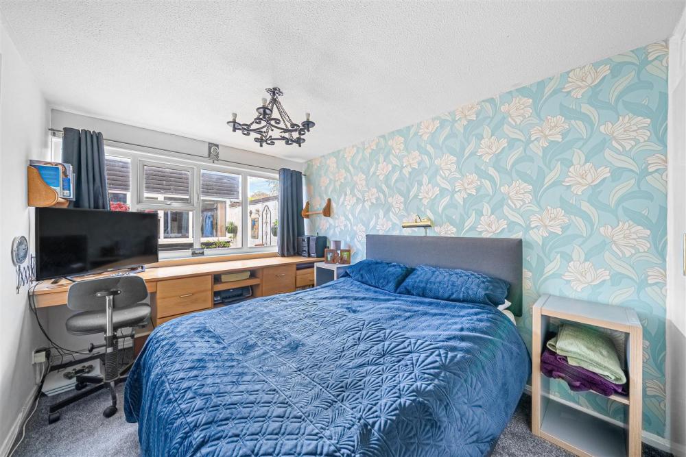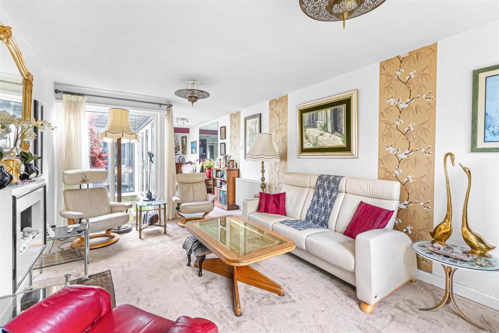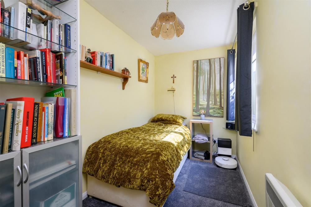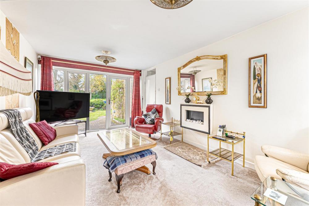 From the dining area, a short passageway with glazed doors opens onto the private courtyard garden, leading through to the comfortable sitting room. This inviting space features further glazed doors to the rear garden, a contemporary wall-mounted fire, and ample room for relaxing. Off the living room is a small lobby giving access to a further single bedroom and a double bedroom, both served by the second shower room.