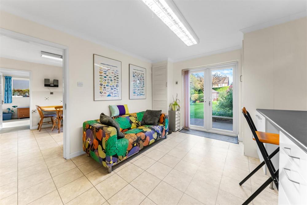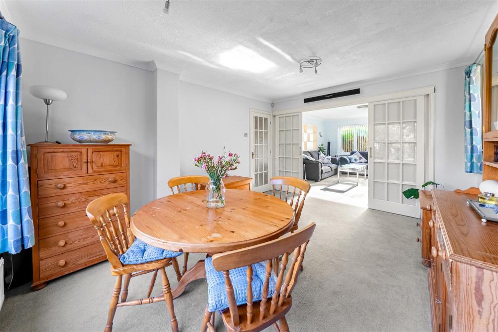 The property opens into a welcoming entrance hall with a large cloakroom, convenient WC and staircase with understairs storage, providing access to all principal ground floor rooms. To the front of the property is a bright and spacious living room featuring dual-aspect windows and a gas fireplace, with sliding doors leading through to the separate dining room.