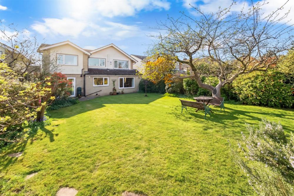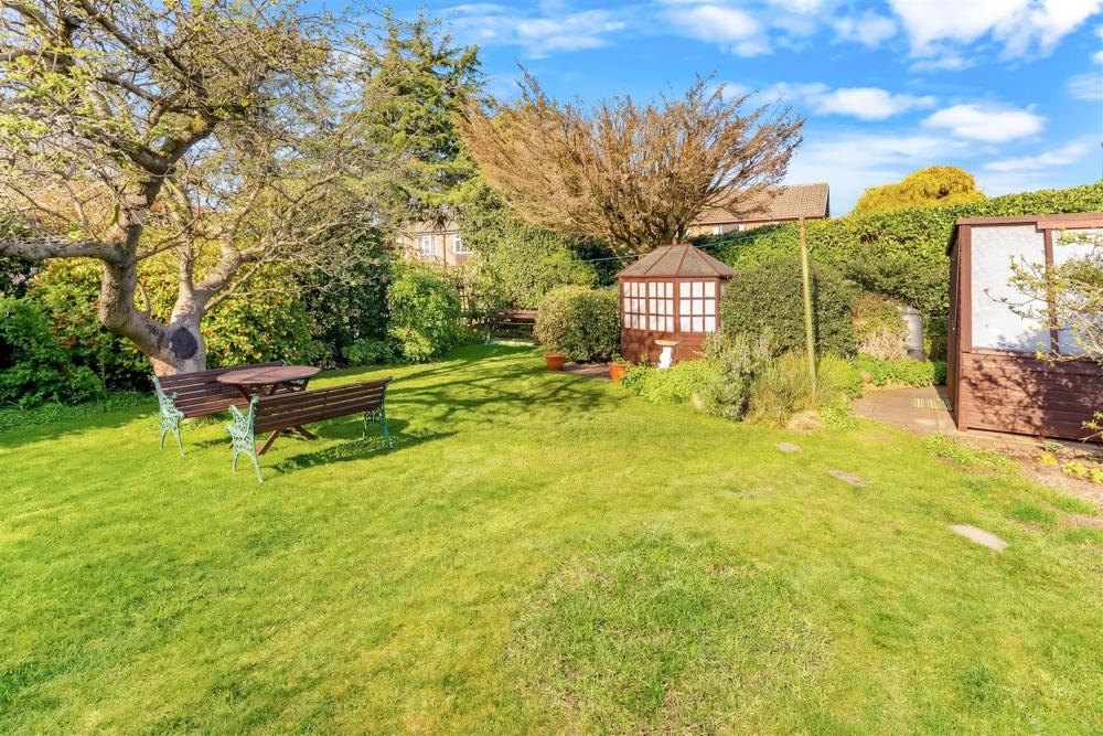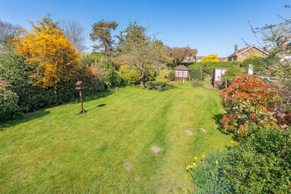 Externally, the property benefits from a large rear garden, predominantly laid to lawn with mature borders and a selection of useful outbuildings including a summer house, potting shed and garden shed. To the front, a driveway and front garden provide access to the entrance and integral garage, offering ample parking and storage.