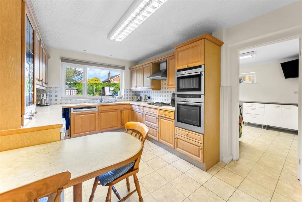 To the rear of the property is the fitted breakfast kitchen, which offers a range of wall and base units along with a gas hob and extractor fan, complemented by integrated Neff appliances including an eye-level oven, microwave and dishwasher. Leading off the kitchen is a large utility room, providing excellent additional storage and space for appliances. Double patio doors from the utility room open out onto the rear garden and the room also provides internal access to the garage.